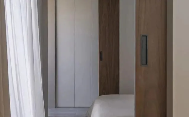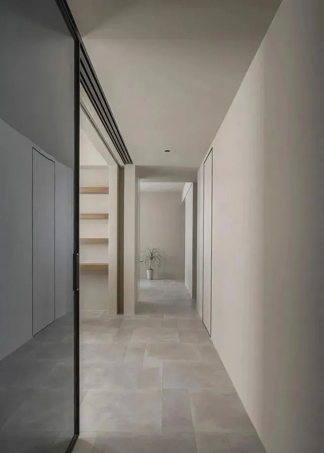 说实话这种设计 , 收纳能力直接拉满。 一边连着门厅 , 一边连着卧室 , 中间用隔墙分开 , 动线清晰 , 不会乱。