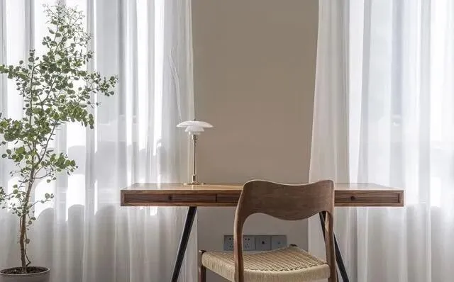 靠窗放了张原木书桌 , 配盆绿植 , 特别清爽。 阳光洒进来的时候 , 在这办公看书 , 心情都好。
