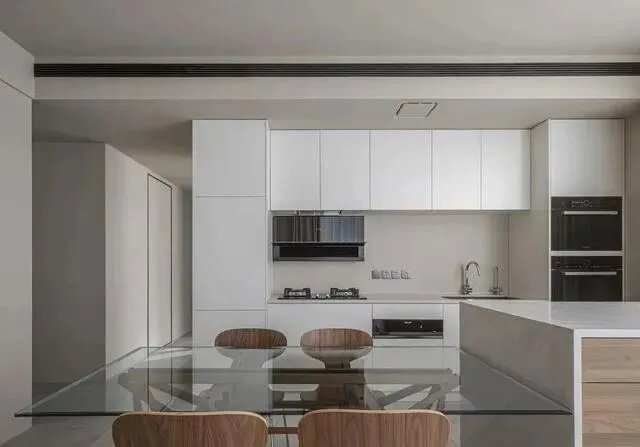厨房是开放式的 , 蒸箱烤箱全嵌入墙里 , 油烟机也藏起来了。 看着干净利落 , 但该有的功能一样不少 , 烟火气十足~