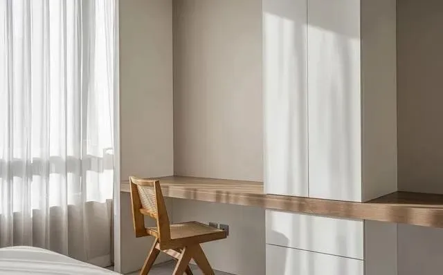 床尾空间也没浪费 , 梳妆台和书桌连在一起 , 中间还加了个储物柜。 化妆、办公、收纳 , 一个区域全搞定。