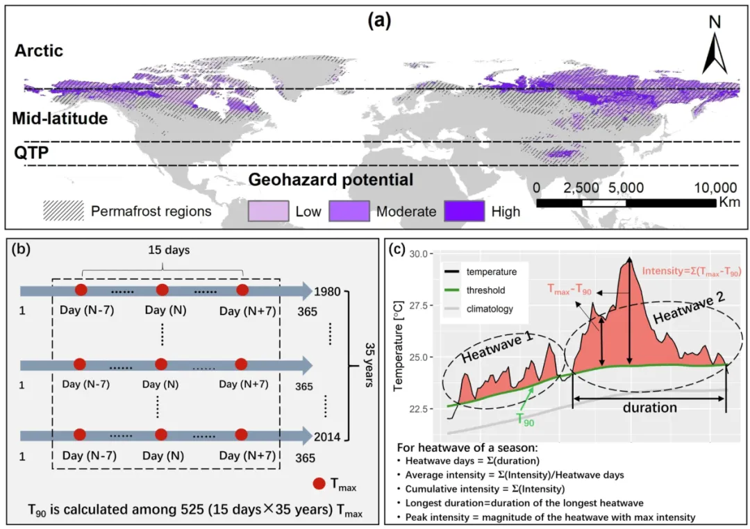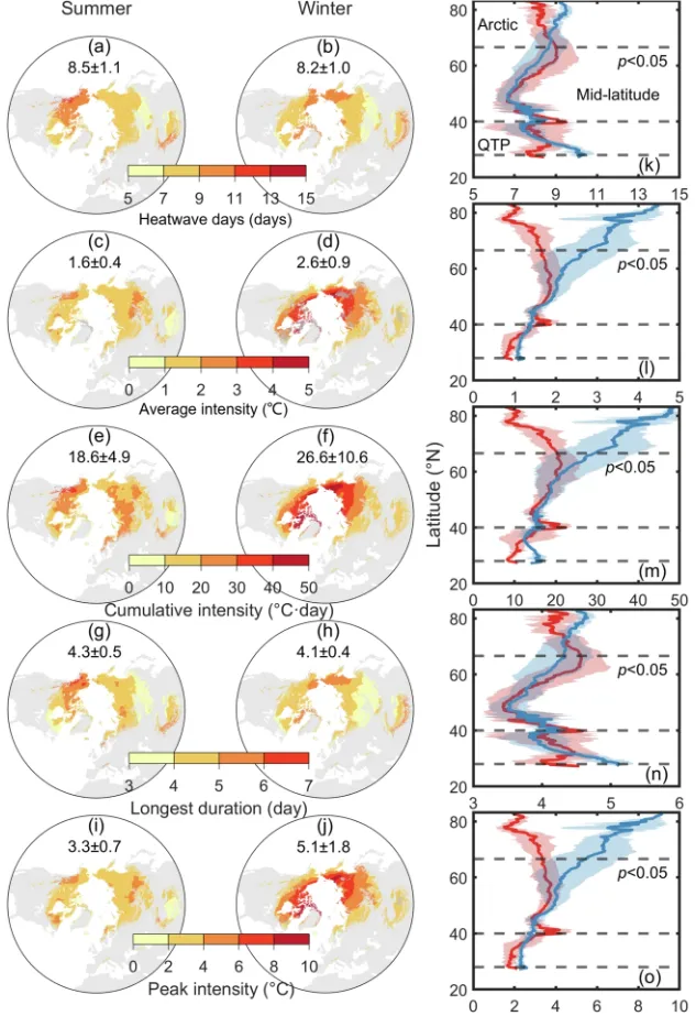 Fig 1. 研究区域及热浪识别概念图。阴影部分表示北半球(a)的永久冻土区,该区域被虚线分为三部分:北极、中纬度和青藏高原(QTP)。此处显示的地质灾害潜力是在RCP 8.5情景下本世纪中叶(2041-2060年)的预测结果110。T90(b)和热浪指标(c)确定的概念图。Fig 2. 1980年至2014年多年平均热浪指标的空间模式。a、b热浪天数(天),c、d平均强度(°C),e、f热浪累积强度(°C·天),g、h最长持续时间(天),i、j峰值强度(°C),以及k-o对应的纬度分布的空间分布。除灰色点标记的单元格外,a-j中的所有网格单元格在p<0.05的水平上均显著增加,且这些值代表夏季(红色)和冬季(蓝色)热浪指标的全球平均值(均值±标准差)。夏季和冬季之间差异的显著性由p值表示。