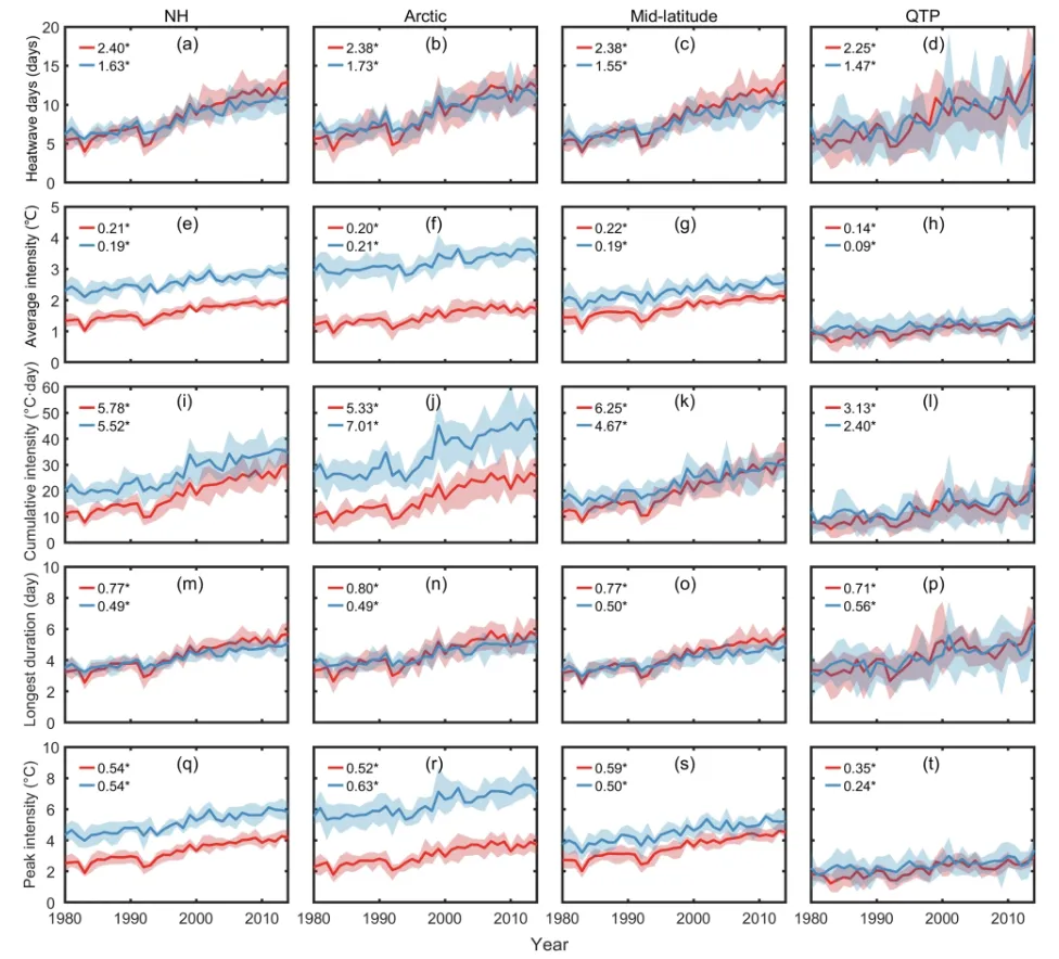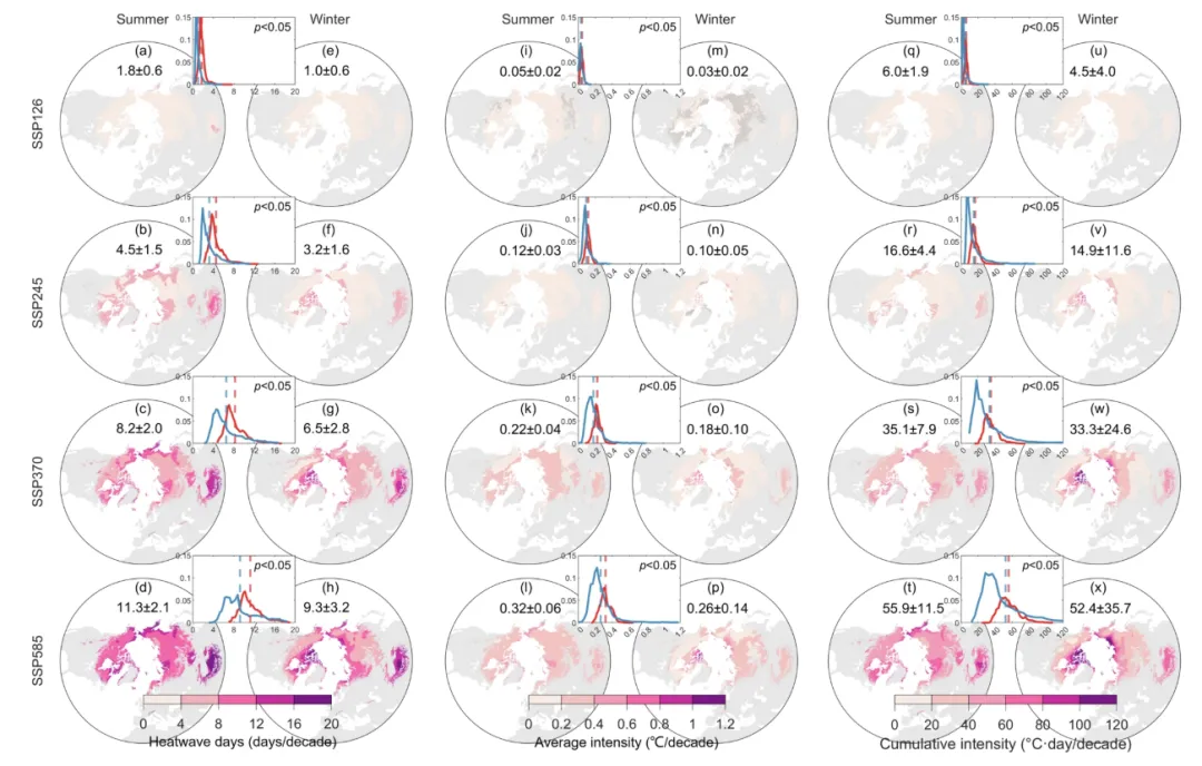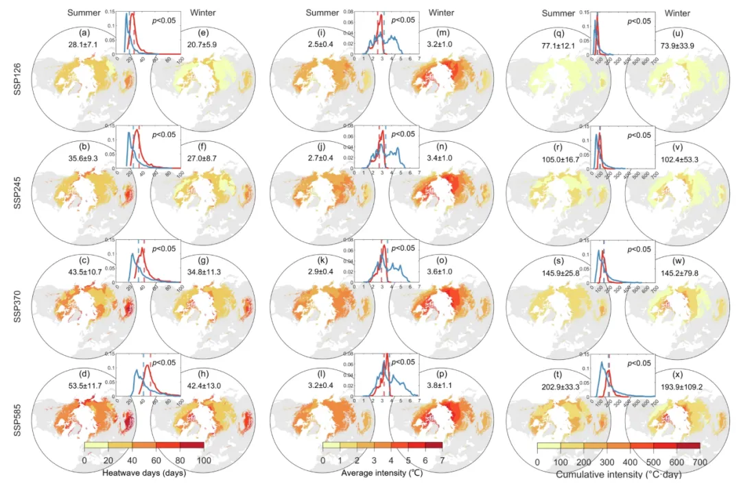 Fig 3. 1980年至2014年热浪指标的时间演变。a–d表示热浪天数(天),e–h表示平均强度(°C),i–l表示热浪累积强度(°C·天),m–p表示最长持续时间(天),q–t表示峰值强度(°C)在北半球、北极、中纬度和青藏高原(QTP)的变化。这些值代表夏季(红色)和冬季(蓝色)热浪指标的年代际趋势。星号表示趋势具有统计学意义(p<0.05)。阴影区域表示热浪指标的四分位数范围。Fig 4.2020年至2100年多年平均热浪指标的空间分布。在SSP126、SSP245、SSP370和SSP585情景下,夏冬季a–h热浪天数(天)、i–p平均强度(°C)和q–x累计强度(°C日)的空间分布。内嵌框代表夏季(红色)和冬季(蓝色)季节热浪指标的概率分布,两者差异的意义由p值表示。虚线代表空间分布图(平均±标准差)显示的热浪指标平均值。