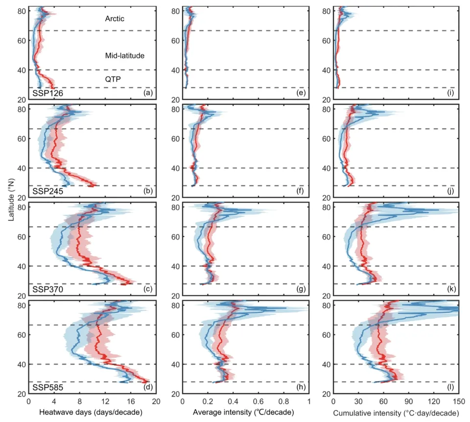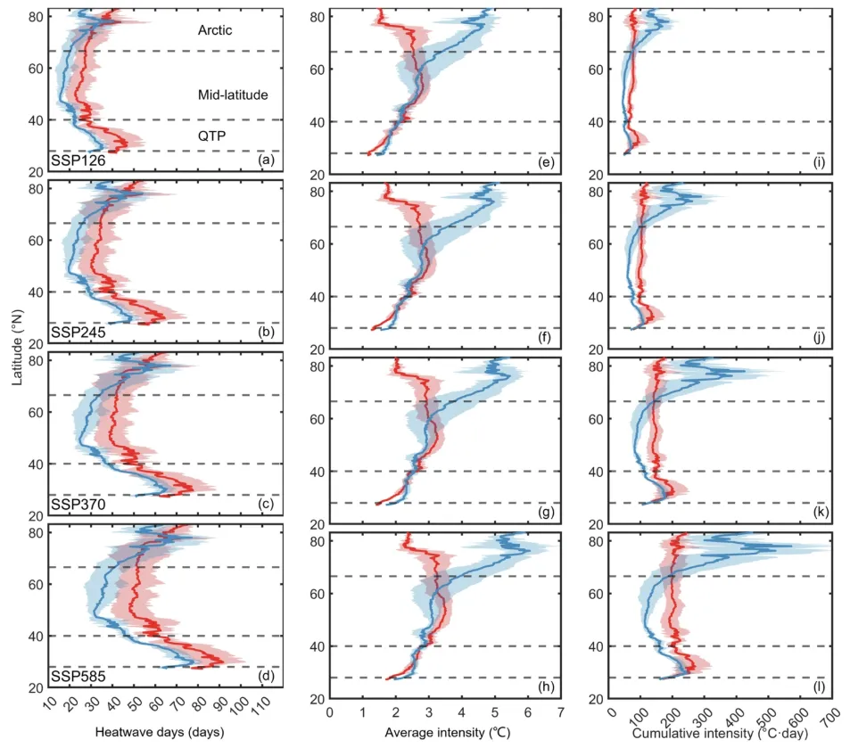 Fig 5. 2020年至2100年多年平均热浪指标的纬度分布。在SSP126、SSP245、SSP370和SSP585情景下,夏季(红色)和冬季(蓝色)季节中a–d热浪天数(天数)、e–h平均强度(°C)和i–l累计强度(°C日)的纬度分布。阴影区域代表同一纬度不同网格的标准差。