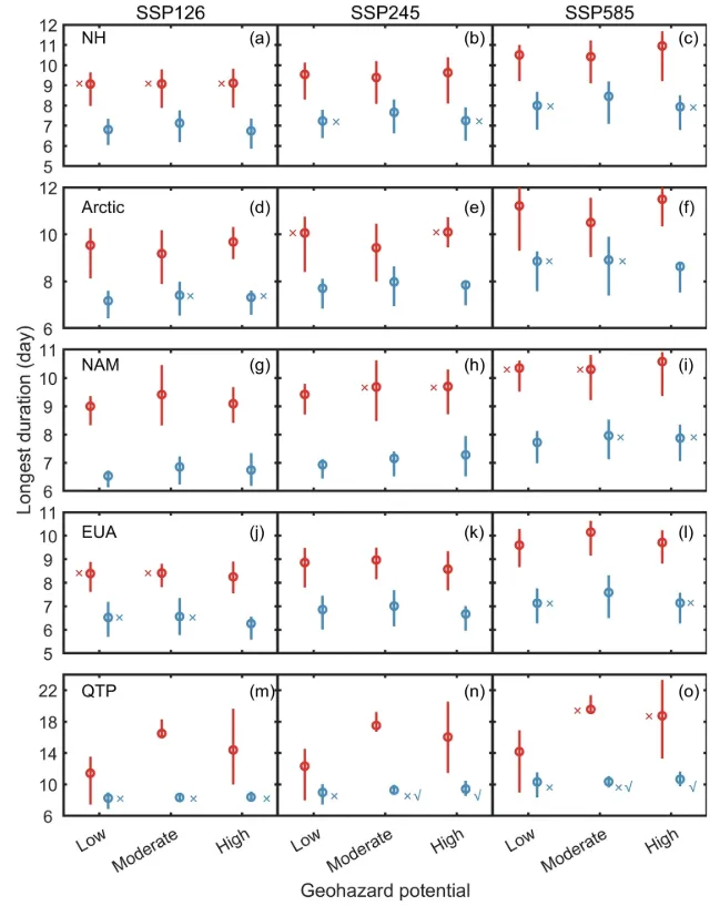 Fig 9.不同地质灾害潜在等级中热浪持续时间最长。在SSP126、SSP245和SSP585情景下,夏季(红色)和冬季(蓝色)热浪持续时间最长,覆盖北半球(NH)、北极(d–f)北极(NAM)、j–1欧亚(EUA)以及青藏高原(QTP)。 统计的极限显示了75%和25%的百分位数,圆圈是平均值。对于某一赛季,所有统计数据彼此差异显著,除了标有交叉标记或勾号的统计数据。