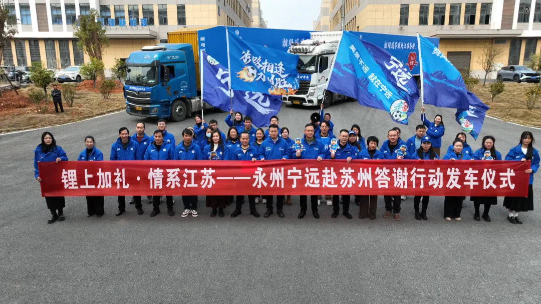 锂上加礼,情系江苏。1月15日下午,宁远赴苏州答谢行动在湖南永信成智能装备有限公司广场启程,县委书记毛政下达发车指令。县委常委、宣传部部长胡红灯,宁远高新区、科工局等相关部门负责人及园区企业、媒体与群体代表参加发车仪式。