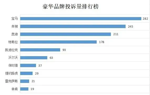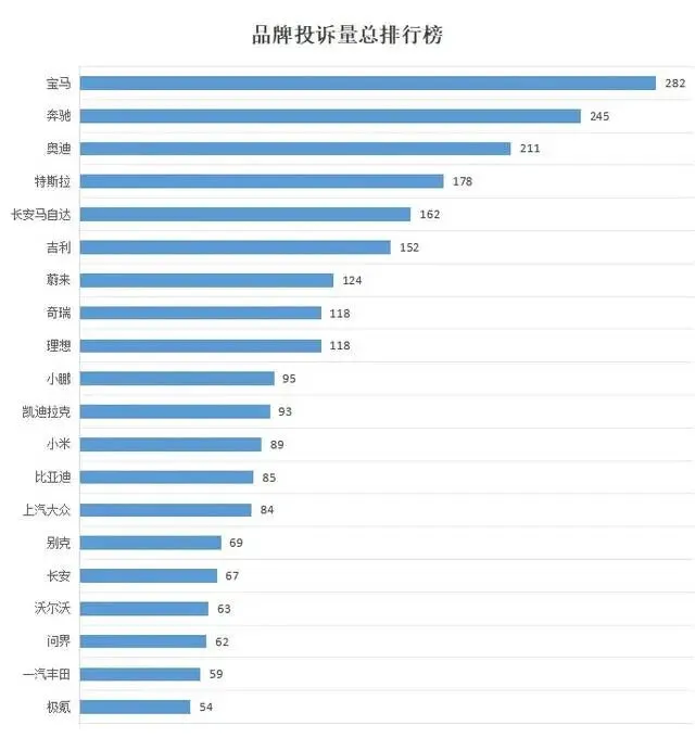 从品牌分布情况看,投诉量排名靠前的品牌中,宝马282宗、奔驰245宗、奥迪211宗、特斯拉178宗,位列投诉量前四位,相关品牌投诉量合计占投诉量前二十名总量的近三成。国产品牌方面,吉利152宗、蔚来124宗、理想118宗、奇瑞118宗、小鹏95宗等品牌投诉量位居前列,新势力品牌投诉规模与部分合资品牌已较为接近。