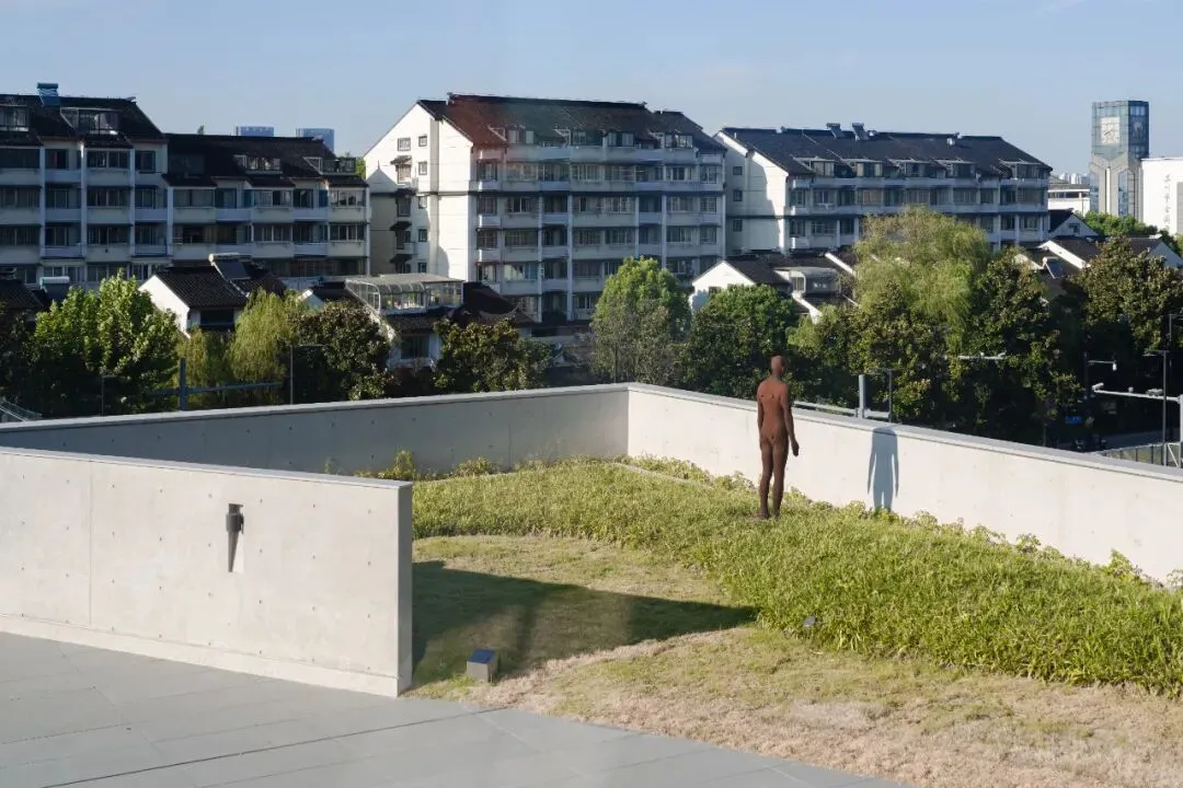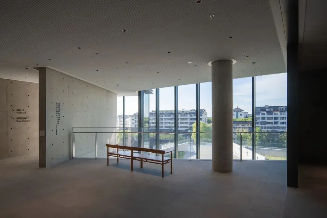 美术馆紧邻上塘河,那是京杭大运河的支流。透过巨大的落地玻璃,或是在三楼的“屋顶花园”和“水之露台”,就可以看到运河上驶过的船只。如果眼神好点、阳光又在线,“姑苏城第一高”北寺塔也能被纳入眼眸。凭着园林中的“借景”手法,就瞬间把姑苏的千年历史拉进了当代的视野里,妙啊!