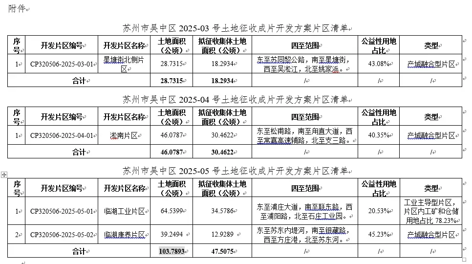 一、同意苏州市吴中区2025-03号土地征收成片开发方案中的1个开发片区,土地征收成片开发范围土地面积28.7315公顷;苏州市吴中区2025-04号土地征收成片开发方案中的1个开发片区,土地征收成片开发范围土地面积46.0787公顷;苏州市吴中区2025-05号土地征收成片开发方案中的2个开发片区,土地征收成片开发范围土地面积共计103.7893公顷。各开发片区土地面积和四至范围详见附件。