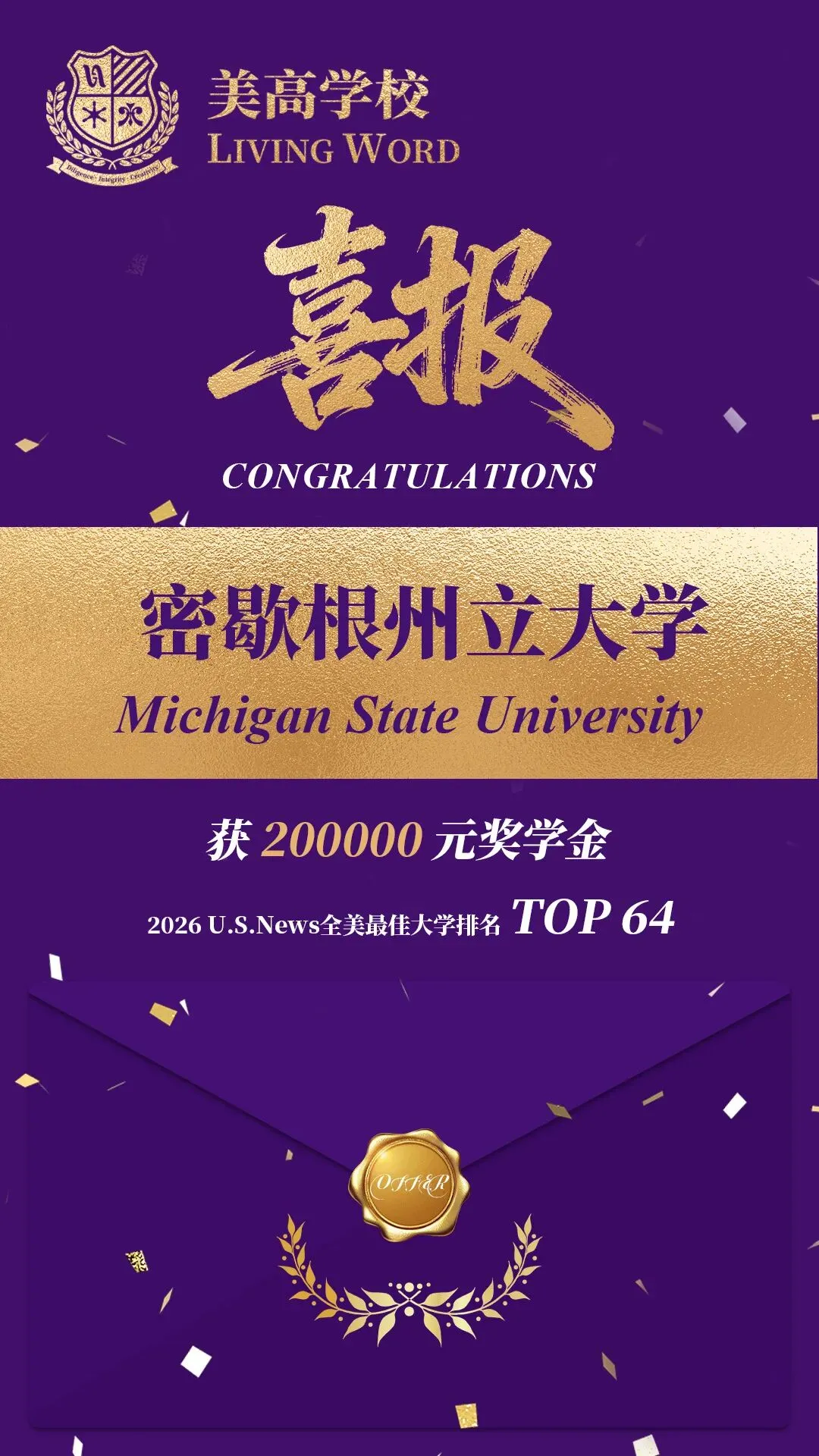 我们无比自豪地宣布,苏州美高学校2026届毕业生Eason同学,在激烈的美本申请中脱颖而出,一举斩获两所美国顶尖公立研究型大学的录取通知书!其中一所更以高额奖学金强力邀约,这无疑是对Eason同学能力的最高认可。