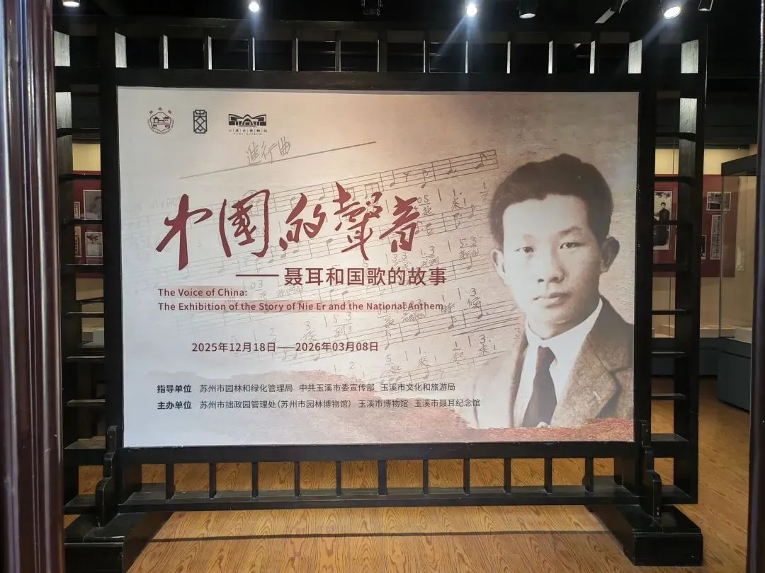 进入博物馆里面的左手面是花篮厅,里面有个特展,是由苏州市拙政园管理处(苏州园林博物馆)与玉溪市博物馆、玉溪市聂耳纪念馆共同举办的《中国的声音——聂耳和国歌的故事》特展,介绍了聂耳的生平事迹、“自强不息、奋斗不止”的精神及创作国歌所承载的炽烈情怀的历史故事。
