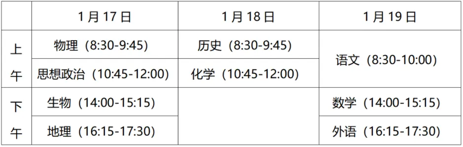 考试时间为2026年1月17日-19日。除语文科目考试时长为90分钟外,其他各科均为75分钟。具体如下: