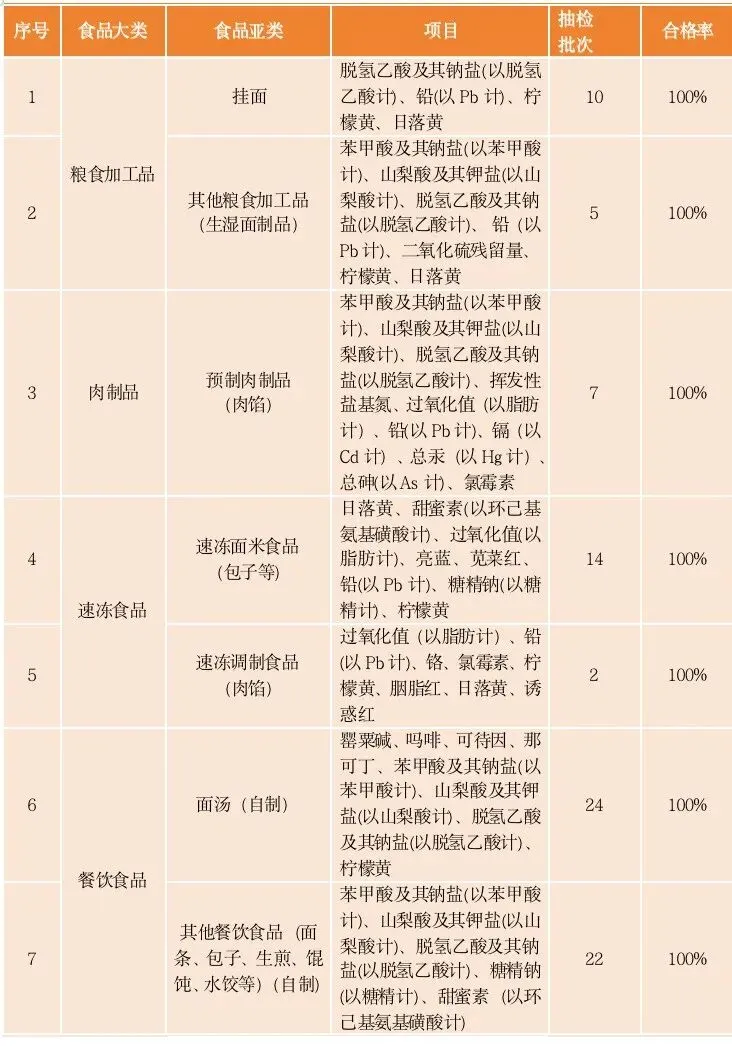 为了让市民吃得安心,近期,市市场监管局组织开展面点类食品专项抽检,重点聚焦连锁经营、网络平台人气较高的面馆、生煎包子店、相关生产企业和中央厨房,覆盖生湿面制品、挂面、速冻面米食品、调理肉制品、面汤等4个大类7个亚类共计84批次,重点开展铅、镉、汞等重金属,苯甲酸、山梨酸、脱氢乙酸、柠檬黄、苋菜红等食品添加剂,罂粟碱、吗啡、可待因、那可丁、硼酸等非法添加检测,均未发现不合格样品,合格率100%。