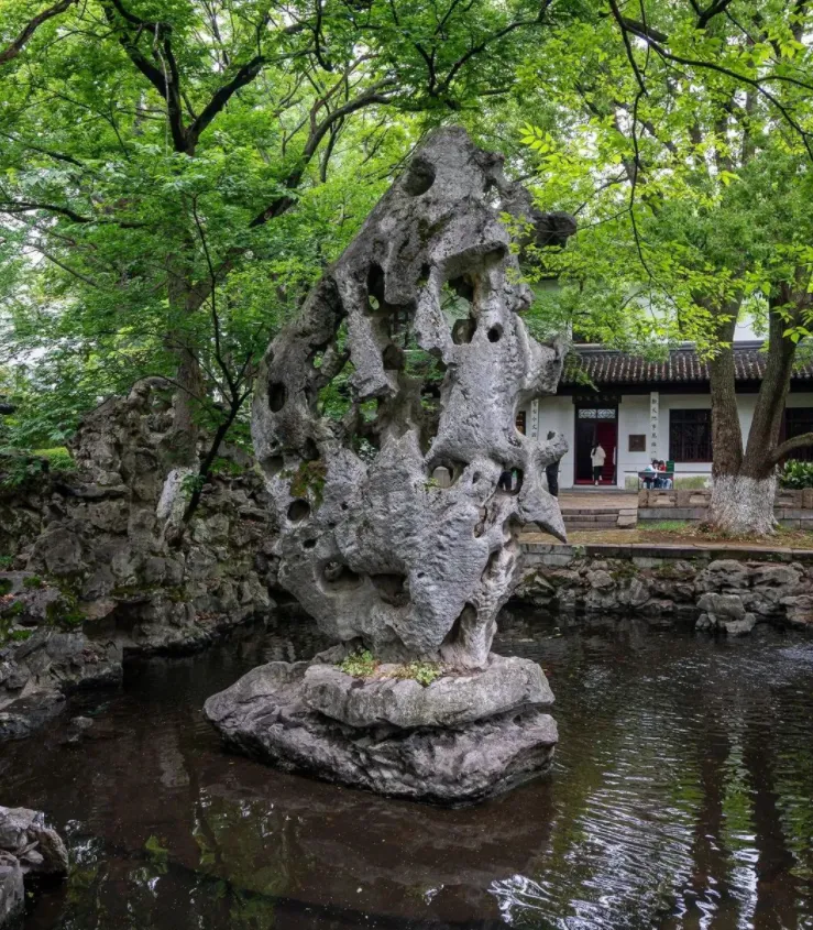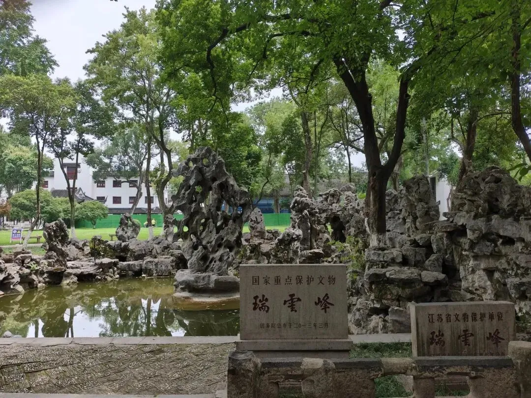 另外,织造署西侧的行宫,是康乾“南巡”驻跸之地,建于康熙二十三年。一汪清池旁,一座5米多高的太湖石巍然矗立,形同巨掌——这便是与上海豫园“玉玲珑”、杭州西湖“皱云峰”并称“江南三大名石”的瑞云峰。瑞云峰是宋朝花石纲事件的遗物,明代嘉靖年间,置于如今的留园,后被收入苏州织造署行宫,成为帝王驻跸时的赏石,它全面呈现了太湖石“皱漏瘦透”的四大特点,被誉为“妍巧甲于江南”,极其珍贵。不过话说回来,小编真的挺羡慕苏州人的,尤其是这个学校的学生,上个学就当每天逛园林,太厉害了,不可思议啊。