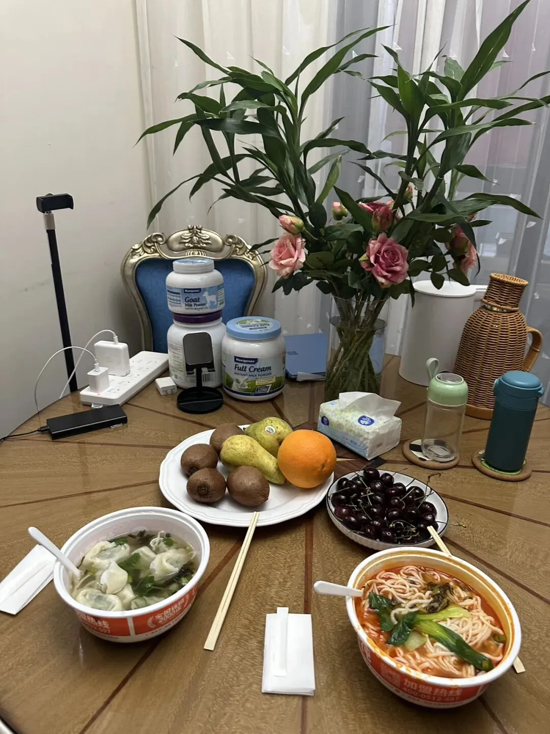 今早,阳光透过窗帘缝隙洒进房间。我迷迷糊糊听到我的手机在响,原来是女儿为我们点了热气腾腾的番茄浓汤馄饨面,还有一盘饱满的荠菜鲜肉馄饨。番茄浓汤色泽鲜红,微酸开胃;馄饨皮薄馅足,荠菜的清香与鲜肉的鲜美在口中交融;而那碗馄饨面,面条筋道,吸满了番茄汤的精华。最惊艳的是那盘水果——车厘子饱满多汁,比利时梨清甜脆爽,为这顿丰盛的早餐画上完美的句号。