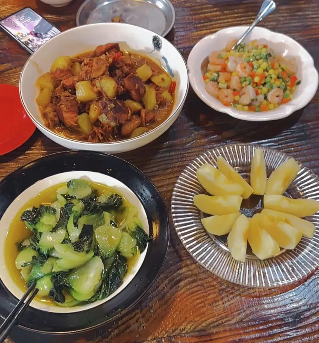 最先上桌的是地锅鸡——铁锅里,鸡肉炖得酥烂入味,配上最爱的小土豆,简直是人间美味。接着是清炒玉米豌豆虾仁,黄、绿、粉三色相映,清新爽口。还有一盘简单的清炒苏州青,却吃出了蔬菜最本真的甜味。