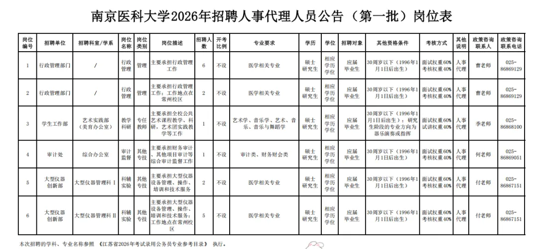 南京医科大学2026年招聘人事代理人员公告(第一批)