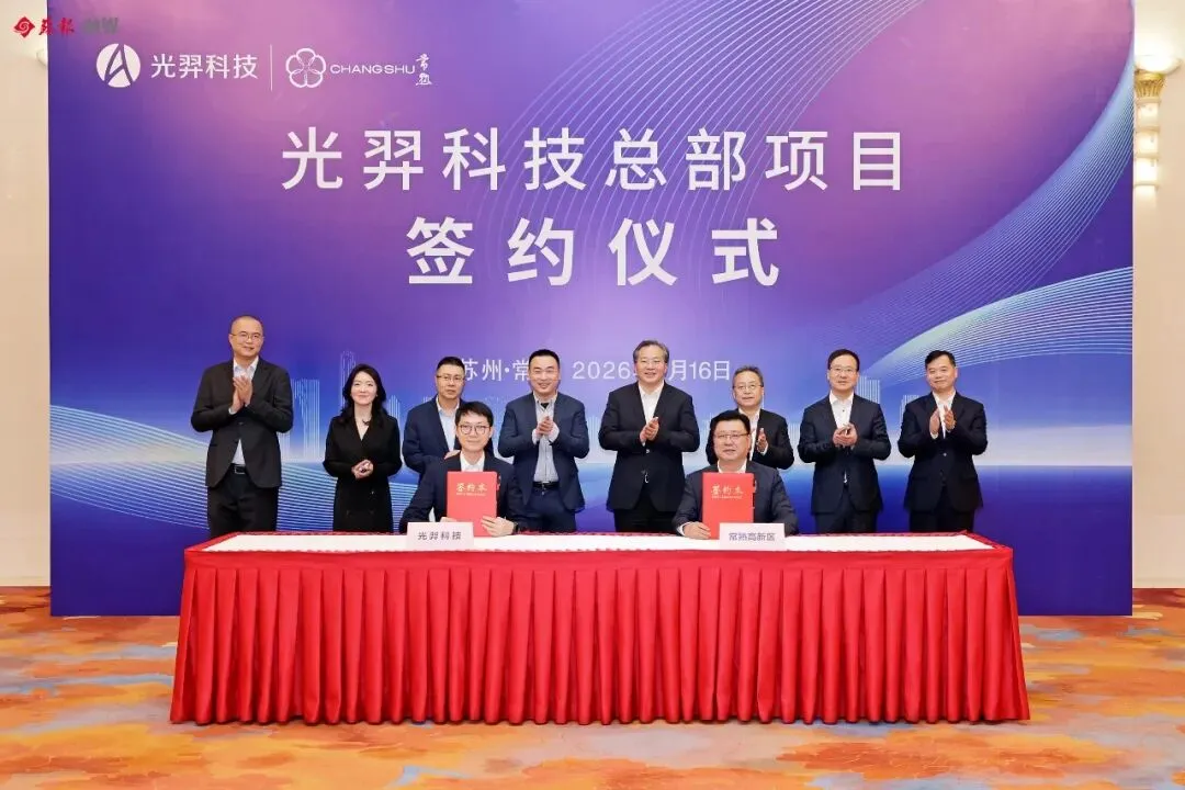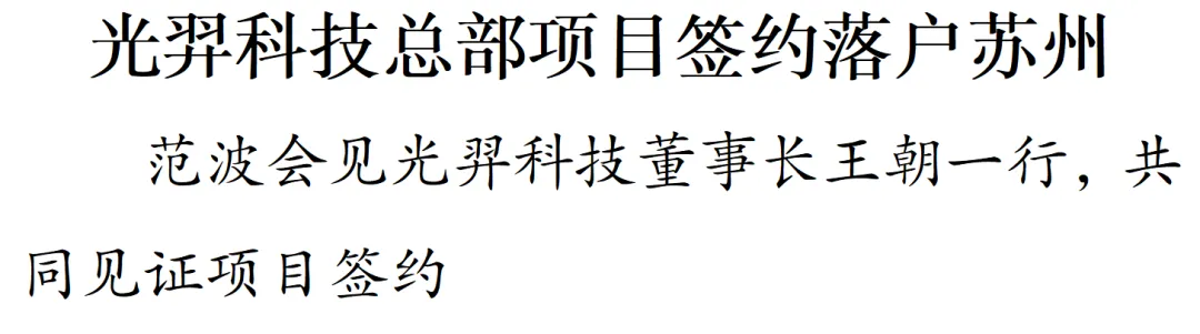 1月16日,注册资本5000万美元的光羿科技总部项目签约落户苏州。苏州市委书记范波会见了光羿科技创始人、董事长王朝一行,共同见证项目签约。