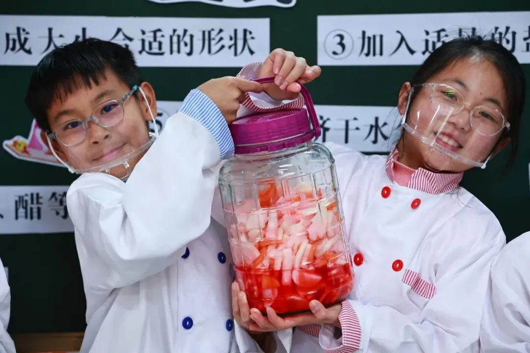 实操环节,孩子们迅速投入状态,洗萝卜、切食材、调佐料、封罐口,分工合作、协作有序。待一罐罐自制腌萝卜香气渐溢,孩子们品尝着亲手制作的成果,脸上满是自豪与喜悦,热爱劳动的种子也在心中悄然扎根。