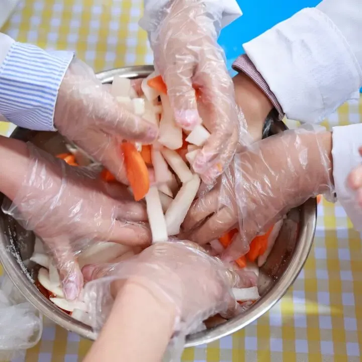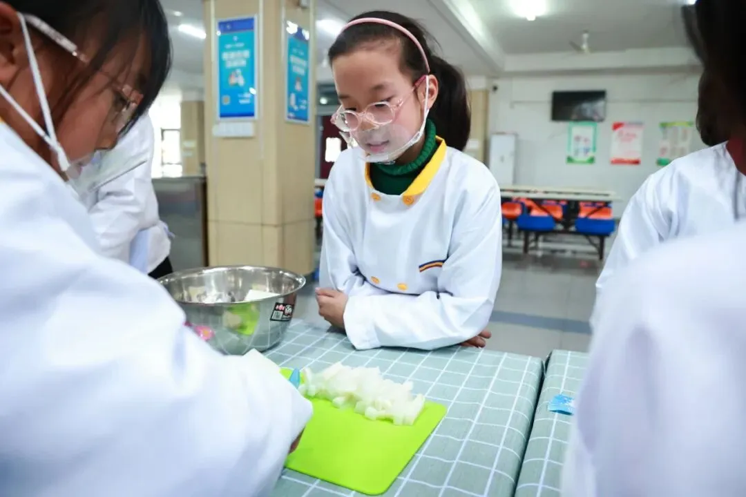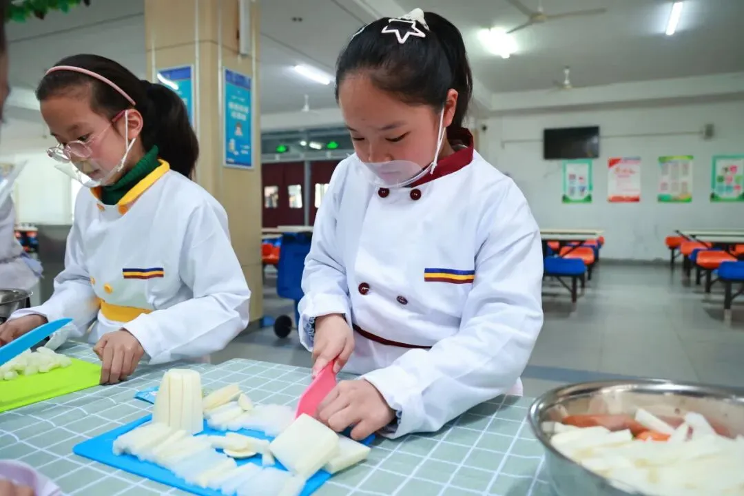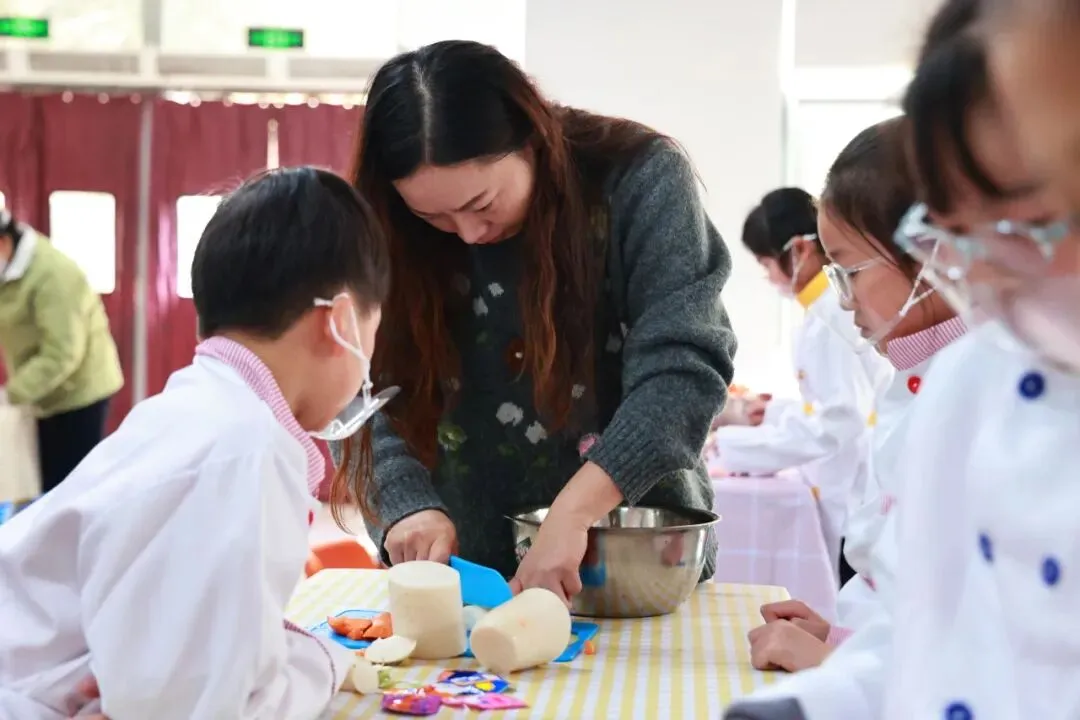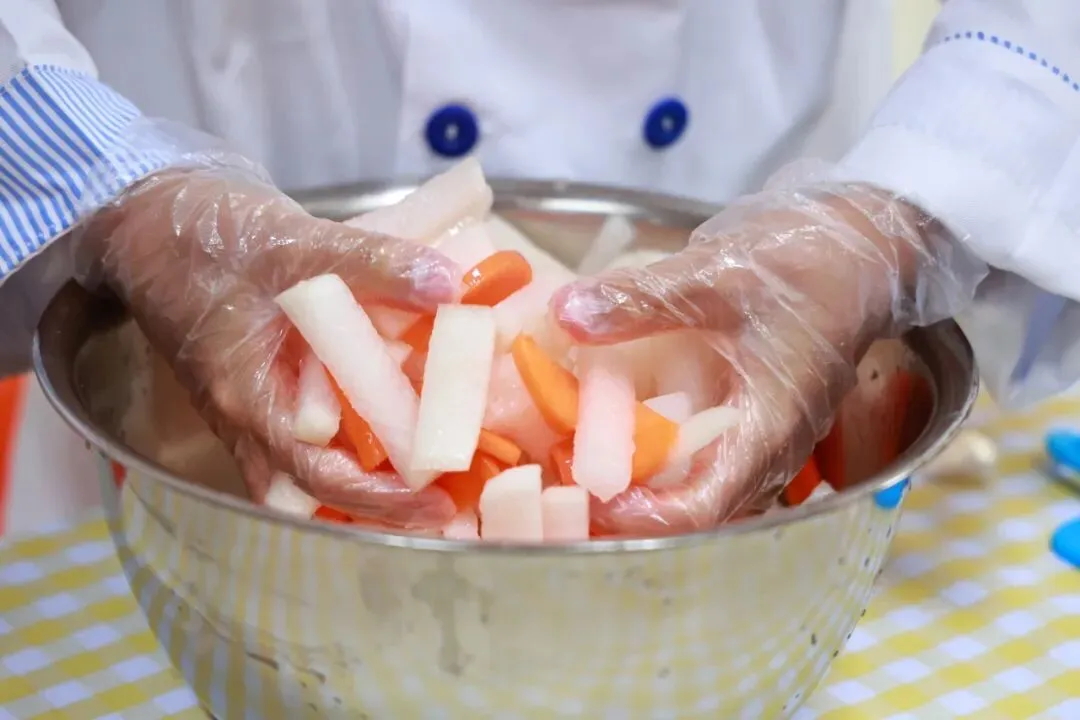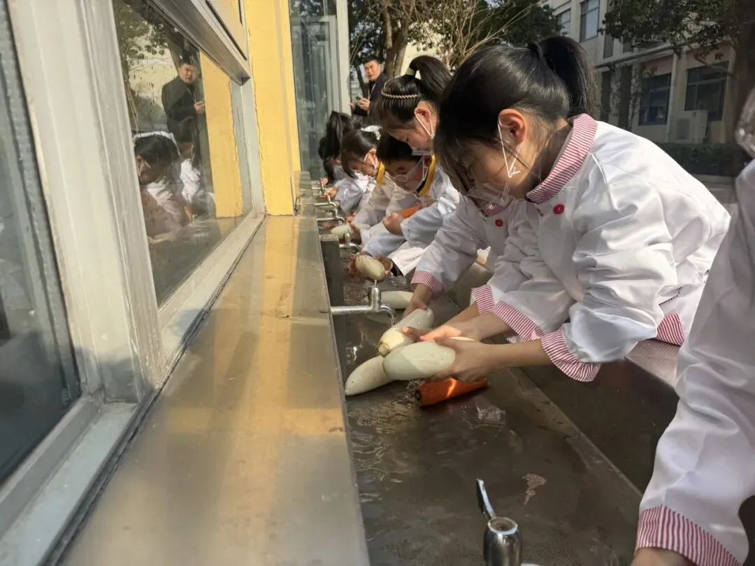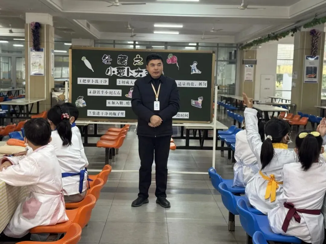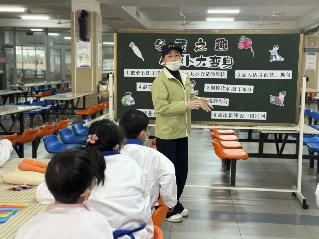 为帮助同学们掌握腌萝卜小技能,学校特别邀请稻中道餐饮有限公司的张阿姨现场指导。从萝卜的清洗、切配,到佐料的调配比例和腌制要点,张阿姨耐心讲解,孩子们围坐一旁,听得认真专注。