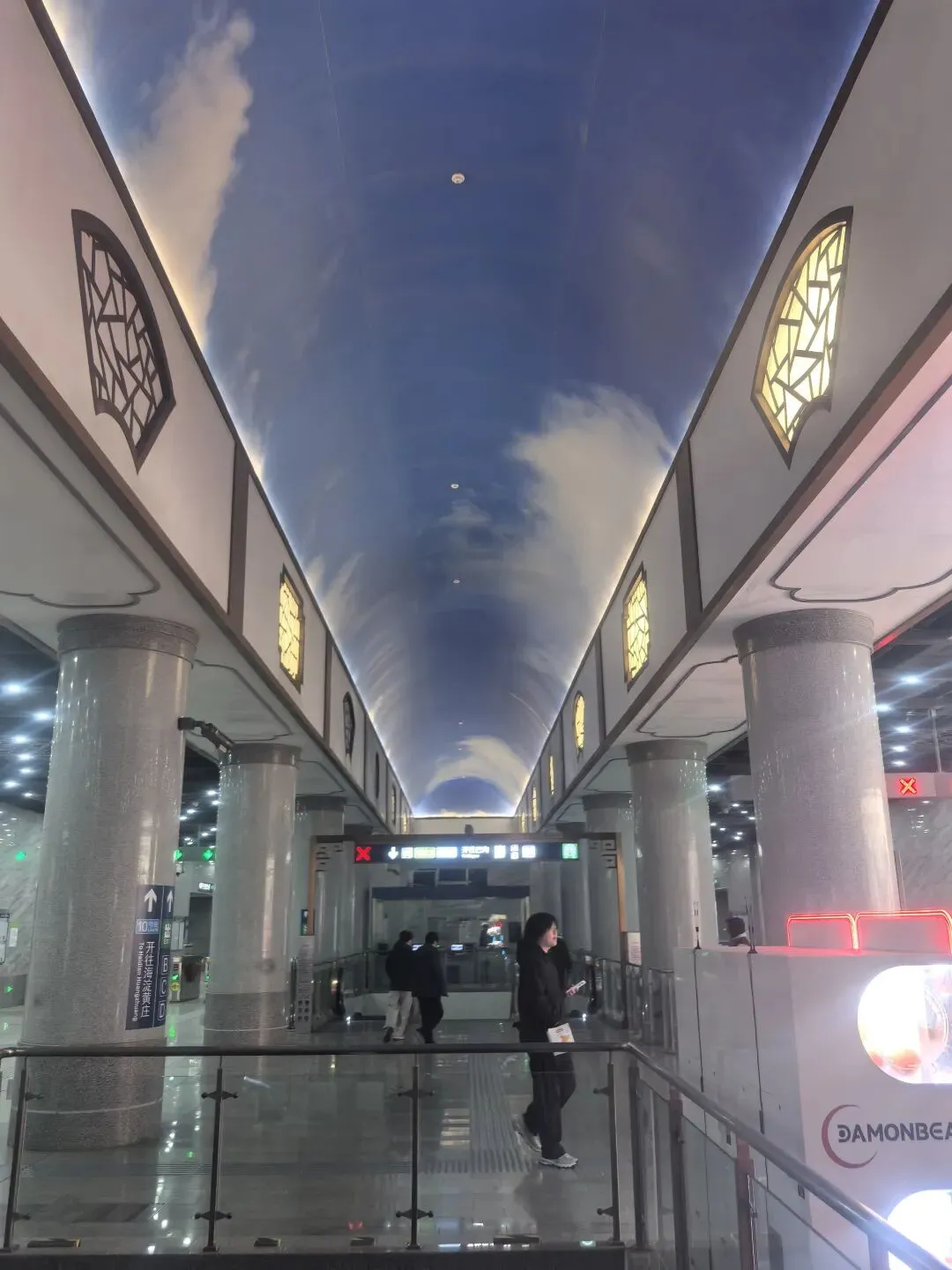 苏州街站的16号线用的白色大理石墙面,整体感觉更为简洁、现代,装饰窗的装饰体现的是江苏民居,使用了蓝天的吊顶。