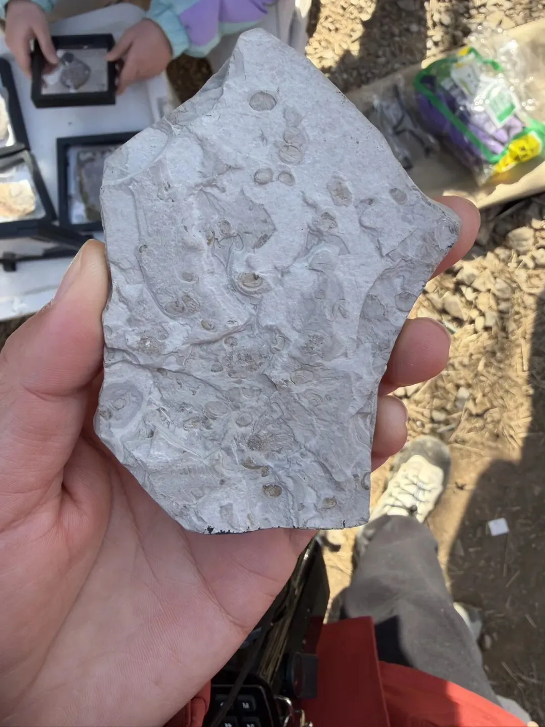 忙活了一个多小时,娃的小收纳盒里已经装了好几块贝壳化石,有的纹理清晰,有的还带着远古生物的印记。他捧着自己的“战利品”,眼睛亮得像星星,逢人就炫耀:“我挖到了2.8亿年前的贝壳!”