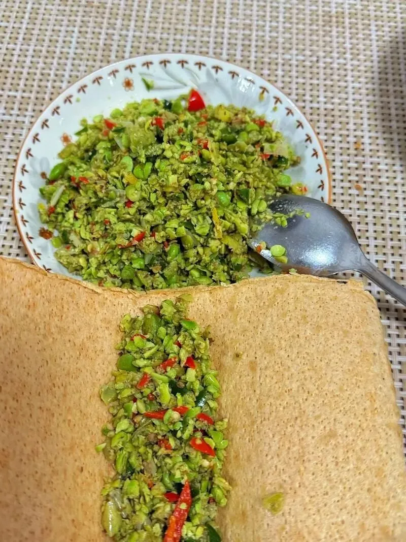 不是山东那种软塌塌的,邳州煎饼讲究薄、脆、焦。杂粮面糊往鏊子上一摊,手腕子一转,薄得透光。刚出锅的时候,边缘翘起来,咬一口咔嚓响。