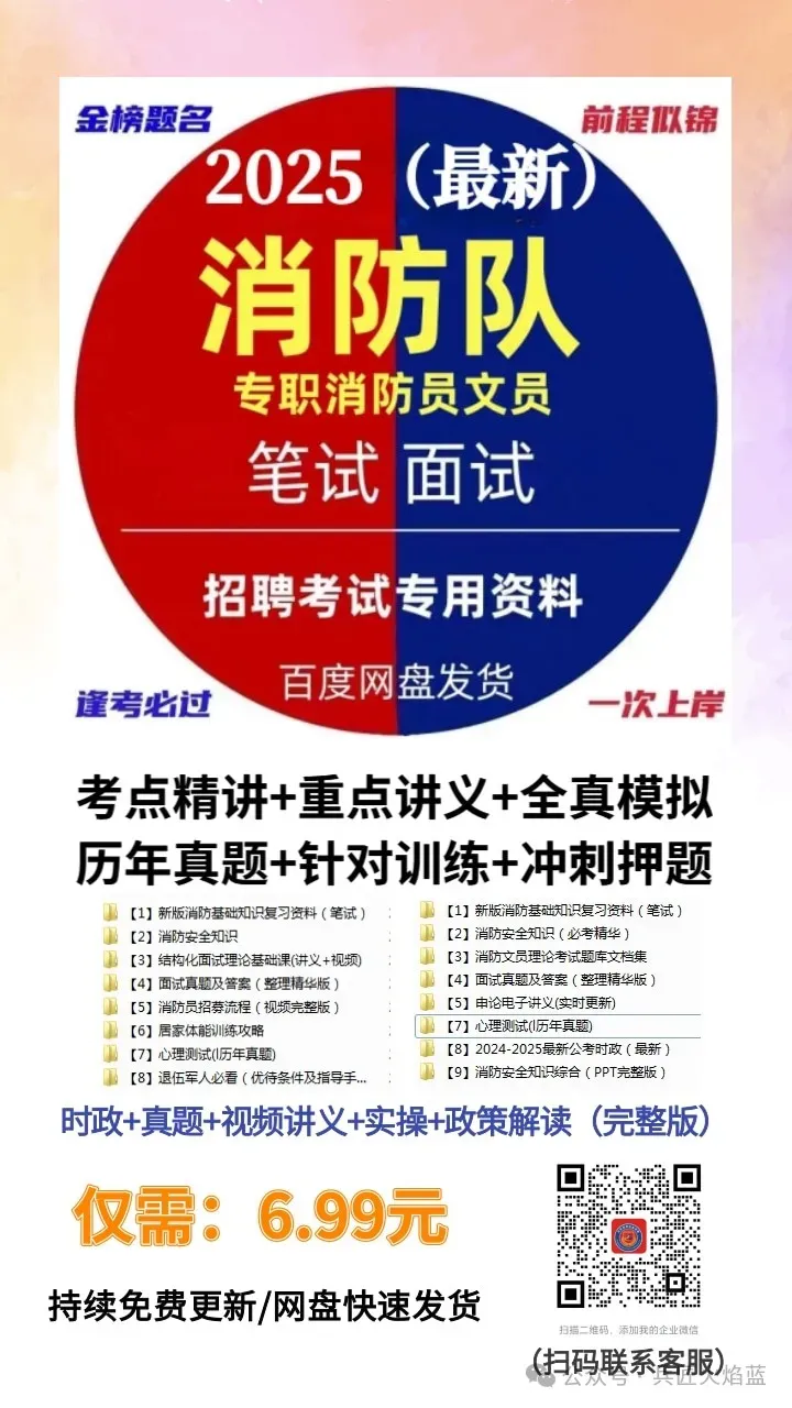 *注:《政府专职消防员(含文职)结构化面试题库》,由“兵匠火焰蓝”团队精心打磨、整理并归纳而成(整合了各省、市、县招录政府专职消防员考试中的历年真题)。如果您也在备考政府专职消防员的招录考试,本题库将助您顺利通过考试,逐梦新蓝。