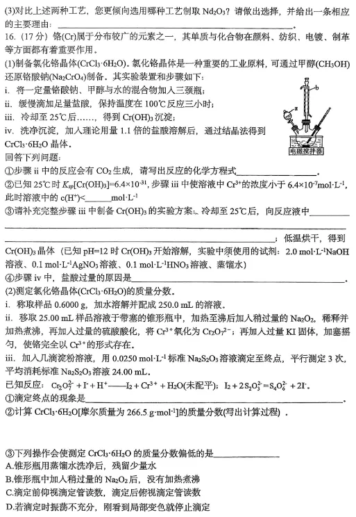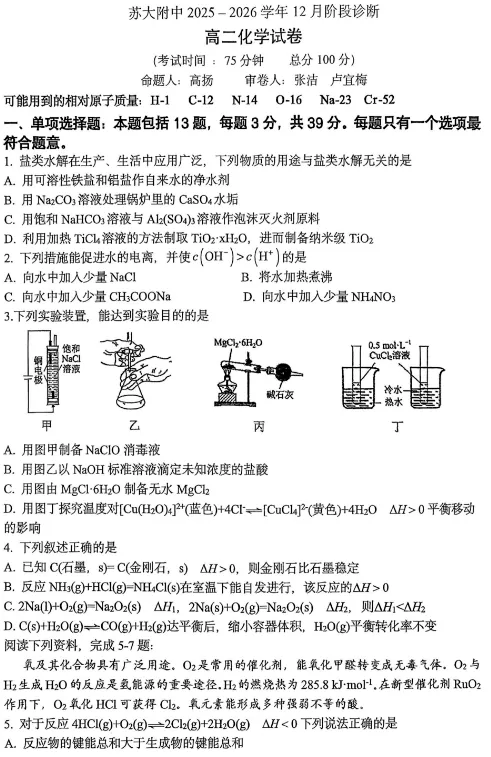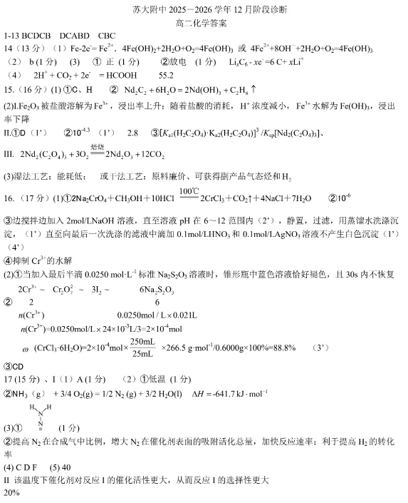 高二化学:清华大学附属中学2027届高二上学期期中考生化学试卷+答案
