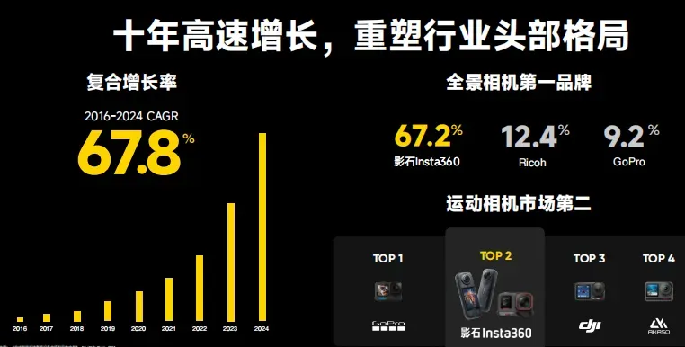 凭借技术创新和对用户需求的精准把握,影石在全球市场高歌猛进。2018年,影石超越三星、理光,登顶全球全景相机市占率第一;2024年影石运动相机市场份额超越GoPro成为全球第一。
