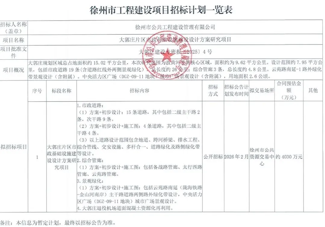 最近在徐州公共资源交易中心看到,徐州未来最有发展的片区大郭庄片区市政建设设计方案研究项目,招标计划发布!预计下个月2月份发布招标公告,本次招标为设计方案研究项目,意思是前前期的设计研究阶段,合同额约为4030万!从设计方案研究项目这个体量来说,这个合同额很高了!足以说明,这个片区太重要,在未来徐州发展中,占有举足轻重的作用!