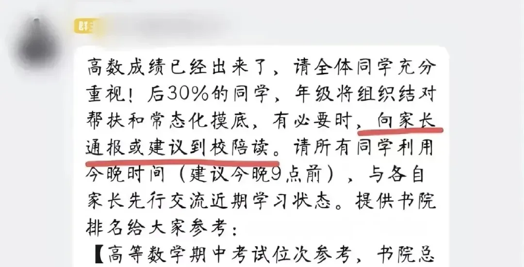也有人认为这是教育责任的“甩锅”,督促学生提高成绩的确是无可厚非,但将这一任务以“陪读”的方式转嫁给家长,不仅对提高及格率无益,更不利于学生独立成长,易滋生“精神上的巨婴”。还有人指出,学生成绩不及格或排名低,高校第一时间不是分析及格率低的深层原因,努力提升教育质量,而是保持“高中化”的思维模式和“找家长”的惯性依赖,这一举动正是“大学高中化”的又一典型案例。