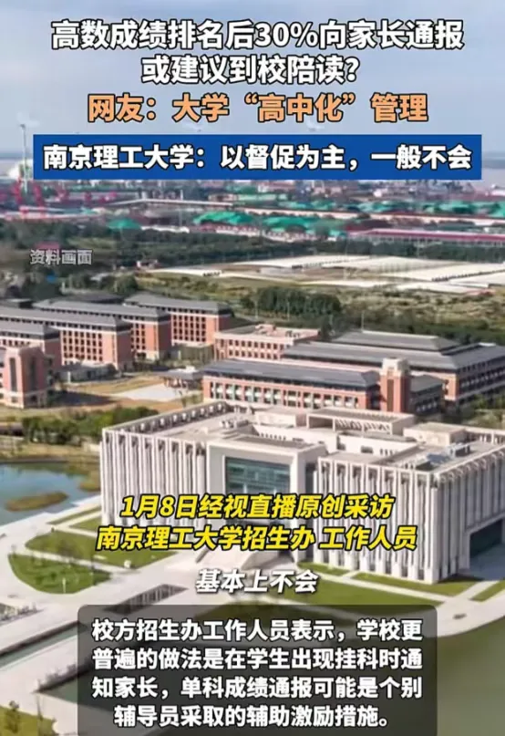 近日,南京理工大学因一则“高数排名后30%将向家长通报,必要时建议家长到校陪读”的通知被推上热搜,将“大学高中化”现象再次推向舆论中心。从晨跑打卡到晚自习监督,从统一熄灯到课堂考勤,越来越多的高校管理模式引发争议:大学,是否正在失去其应有的独立与自由?
