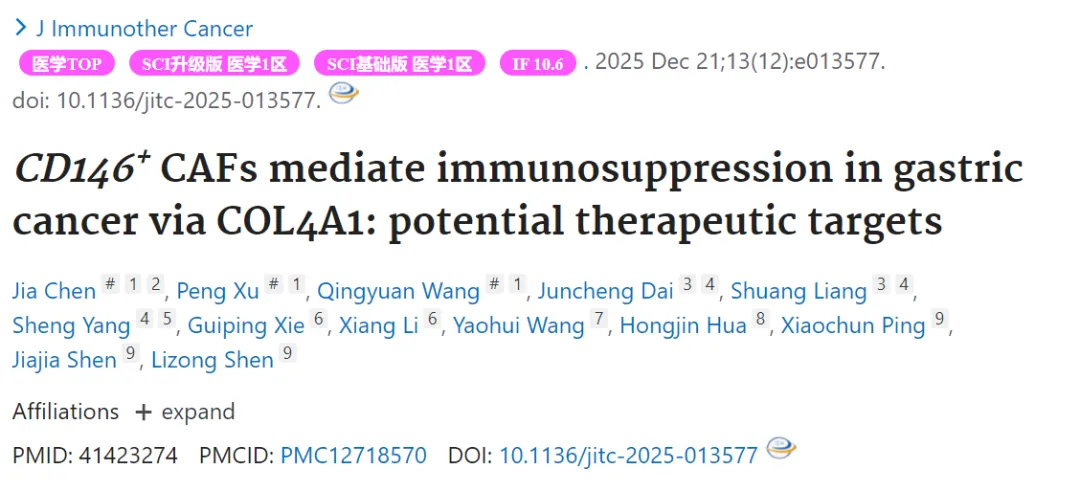 中文标题:CD146+CAFs通过COL4A1介导胃癌中的免疫抑制:潜在治疗靶点