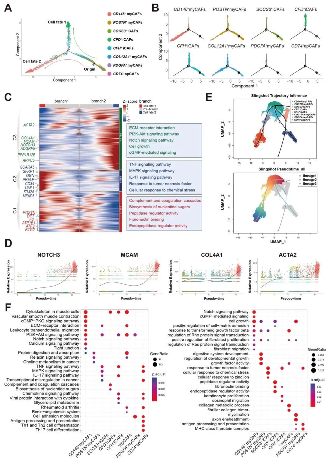 从 8322 个成纤维细胞中鉴定出 8 个亚群,CD146+CAFs 在肿瘤组织中显著富集(图 1C-D),且几乎不存在于正常黏膜。该亚群高表达 NOTCH3、CD146 及 COL4A1(图 1J),伪时间轨迹分析显示其起源于 SOSC3+iCAFs 样前体细胞,富集 Notch、PI3K-AKT 等通路(图 2F)。