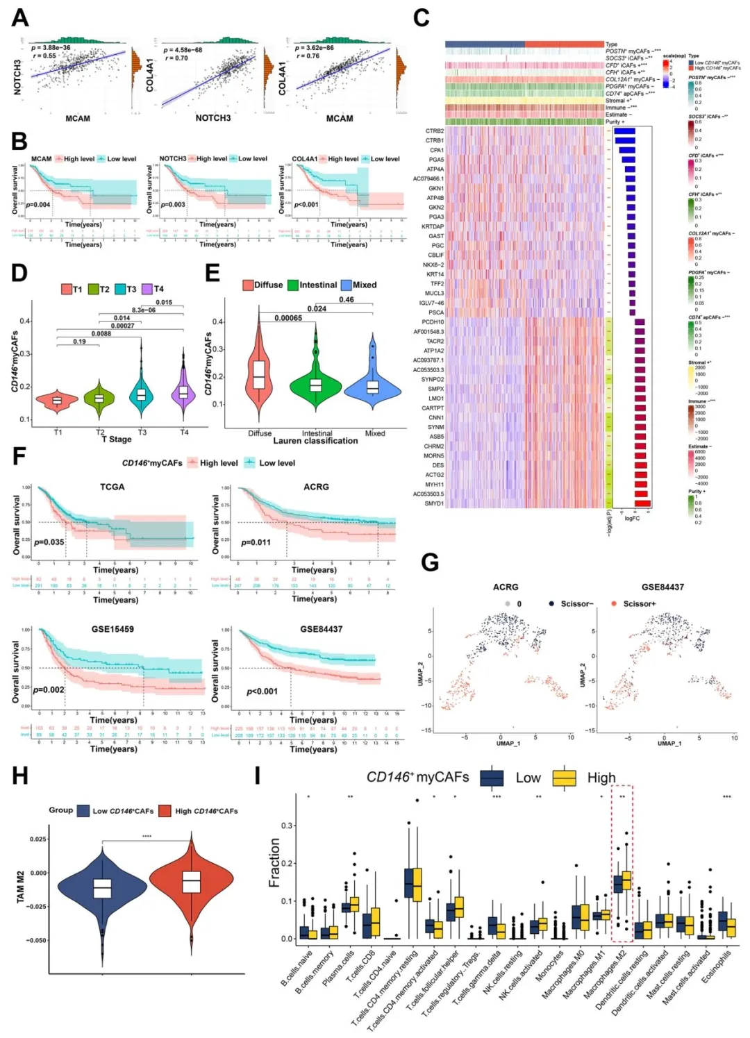 TCGA-STAD 数据库显示,CD146、NOTCH3、COL4A1 高表达与胃癌患者短生存期相关(图 4B)。CD146+CAFs 丰度与肿瘤 T 分期、Lauren 分型相关,且与 M2 型肿瘤相关巨噬细胞(TAMs)浸润呈正相关(图 4H-I),提示其参与免疫抑制。
