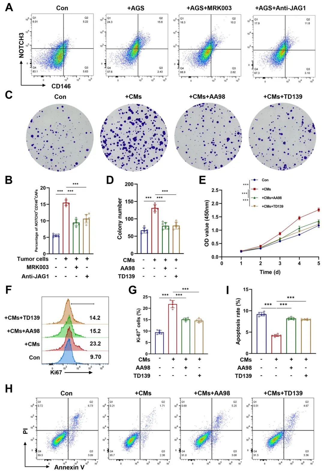 3D 共培养实验表明,胃癌细胞通过分泌 JAG1 结合 CAFs 表面 NOTCH3,同时通过 LGALS3 结合 CD146,双重信号促进 CD146+CAFs 增殖并抑制其凋亡(图 5A-I)。抑制剂或中和抗体可阻断该效应,证实信号通路的关键作用。