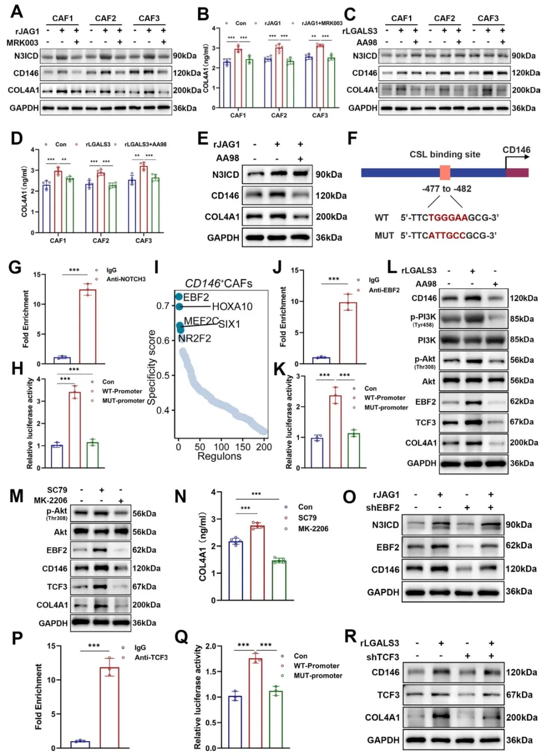 NOTCH3 激活后结合 CD146 启动子驱动其转录,LGALS3 激活 CD146 下游 PI3K/AKT 通路,通过转录因子 EBF2 放大 CD146 表达,同时通过 TCF3 促进 COL4A1 分泌(图 6F-R),形成正反馈环路强化其功能表型。