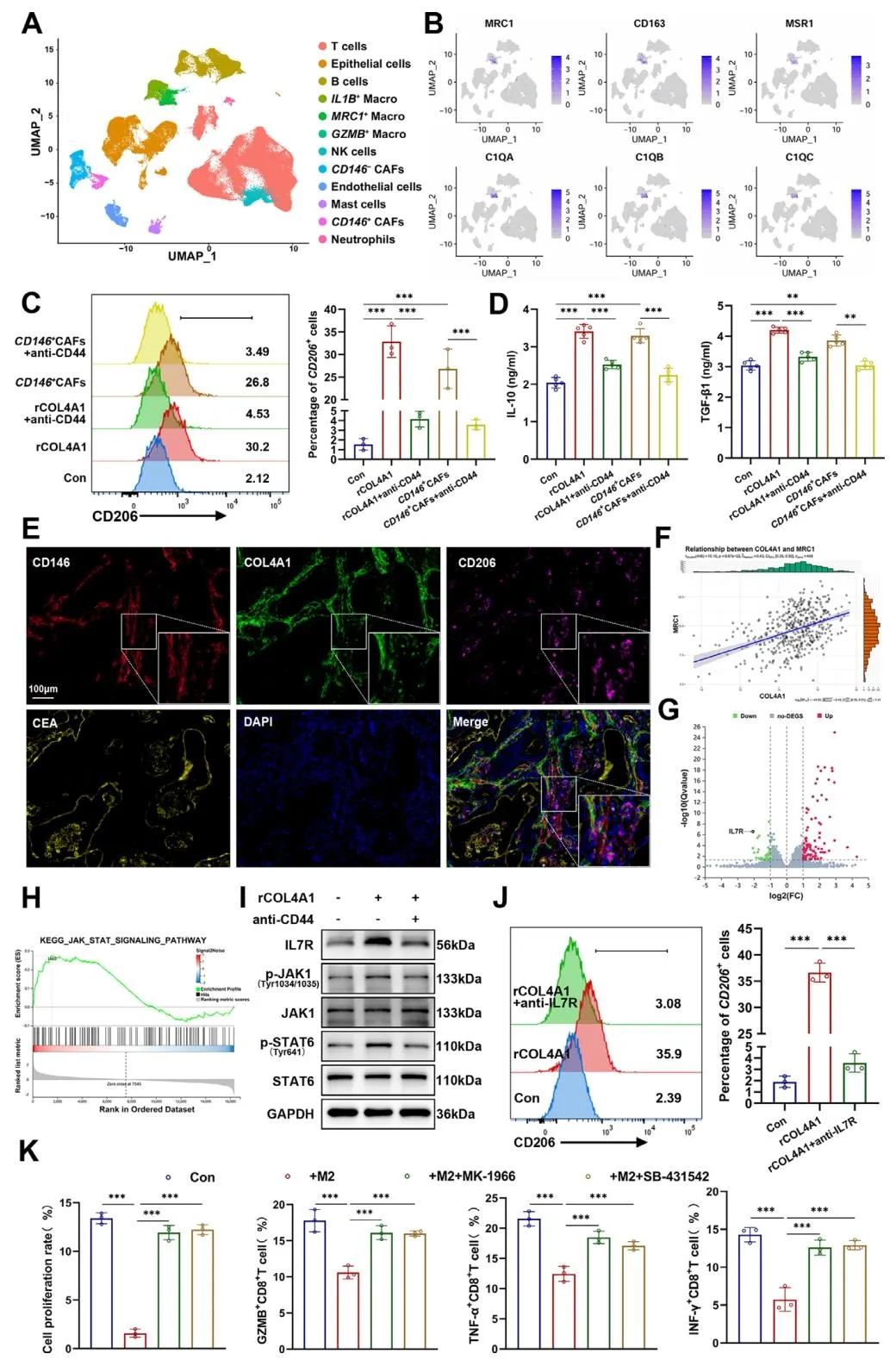 CD146+CAFs 分泌的 COL4A1 结合巨噬细胞表面 CD44,激活 JAK1-STAT6 通路促进 M2 极化(图 7C-D),且 IL7R 是关键下游分子(图 7G-I)。M2 型巨噬细胞通过分泌 IL-10、TGF-β1 抑制 CD8+T 细胞增殖及细胞因子分泌(图 7K)。