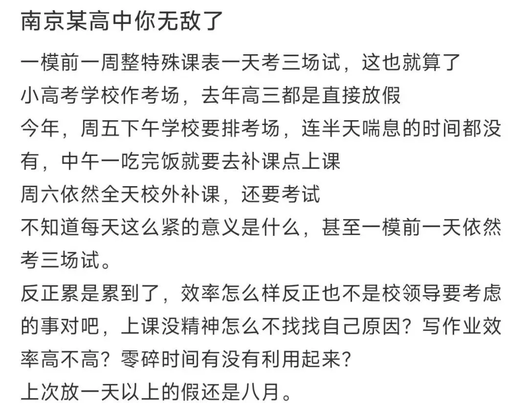 >操作窒息,卷到病态,南京某高中高三生吐槽!一模前一周天天三考,周末还要出去补课