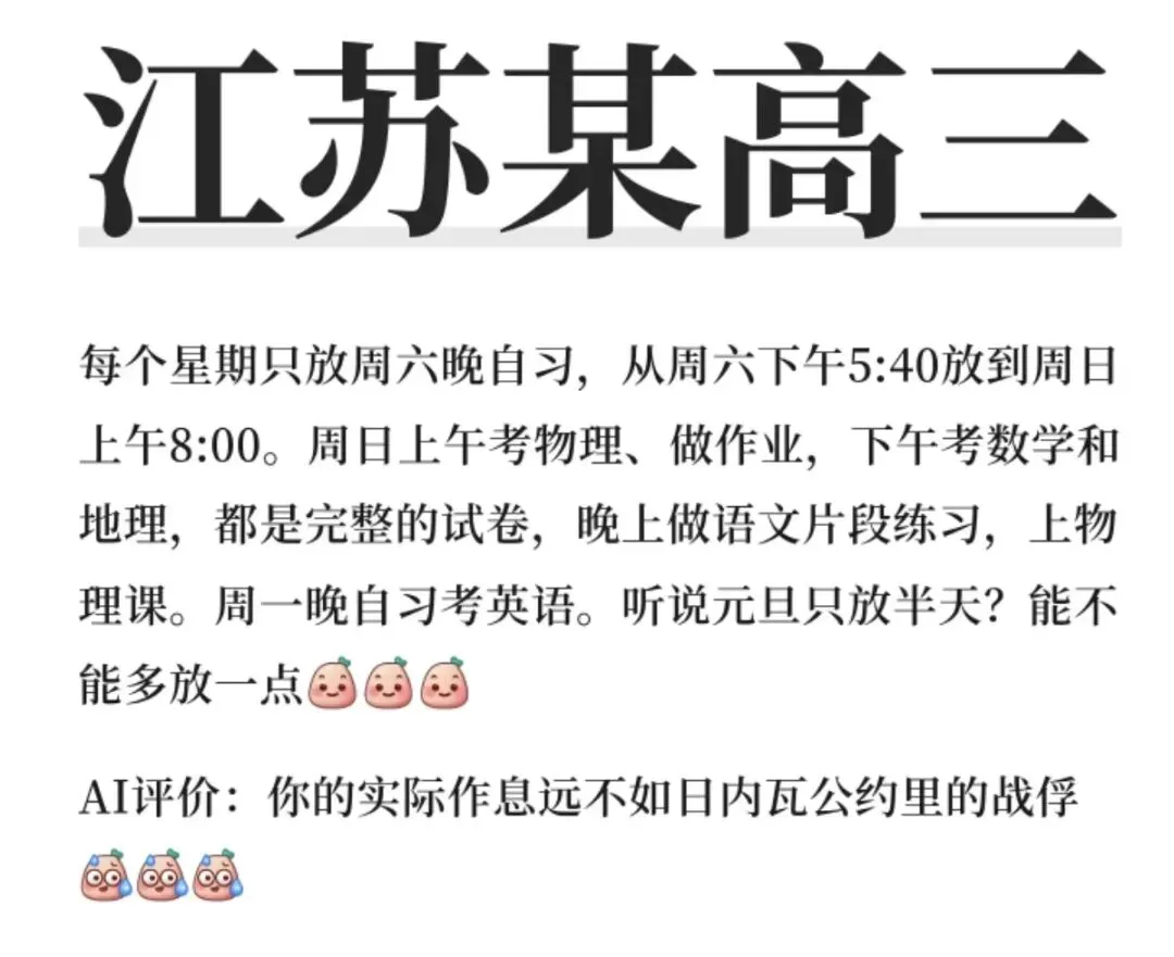 但换个角度看,校方的严苛安排也并非毫无缘由。高考的竞争压力客观存在,学校作为升学培养的载体,难免会陷入“用时间换分数”的惯性思维,试图通过密集的学业安排帮学生抓住备考的每一分钟。