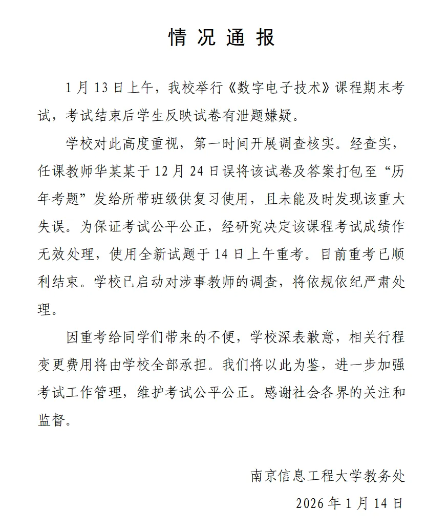 为保证考试公平公正,经研究决定该课程考试成绩作无效处理,使用全新试题于14日上午重考。目前重考已顺利结束。