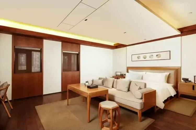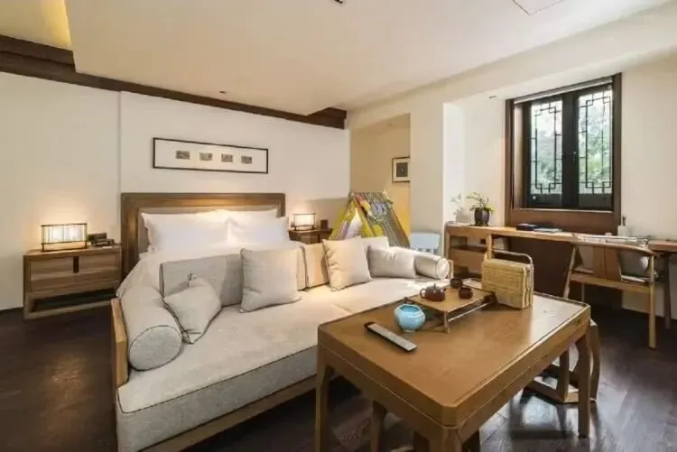 芥子园63间客房里,木茶几、木柜、镂空木门的运用,营造出天然的舒适感。新中式风格的床铺、沙发,又增添了几分现代感。