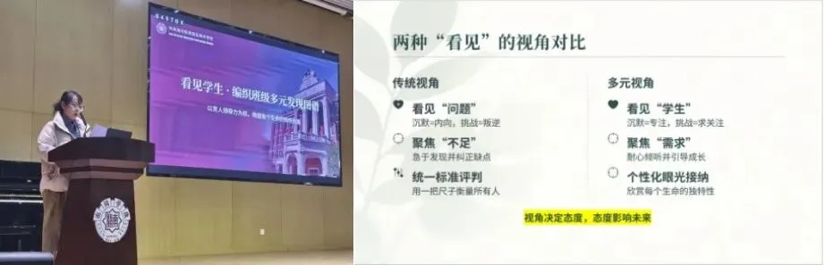 窦海艳老师以《看见学生:编织班级多元发现图谱》为题,提出“育人领导力是班级发展的导航系统”。她指出,班主任应从“资格化”与“社会化”双重路径推动学生“主体化”实现,并通过“沉默者—全能者—挑战者”三类学生的案例转化,阐明多元智能视角下学生成长潜能的识别机制与支持路径。