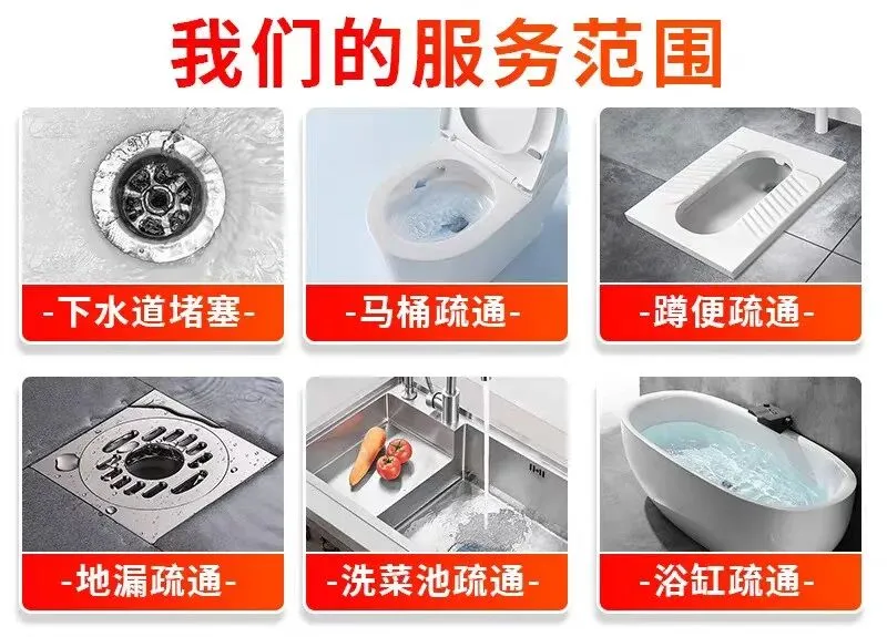 疏通下水道、马桶、蹲厕、地漏;疏通下水管;维修马桶漏水;维修水管;卫生间除臭、反味处理;脸盆、菜盆疏通;疏通墩布池;通坐便、蹲便、小便池;除尿碱;打捞贵重物品;疏通主管道、疑难管道、市政管道、工业管道;高压清洗车、抽粪车服务;上下水管安装、改管、维修疏通下水道:家庭、酒店、饭店、店铺的下水道,小便池、阴沟等下水管道疏通,卫生间、厨房、阳台下水管道疏通