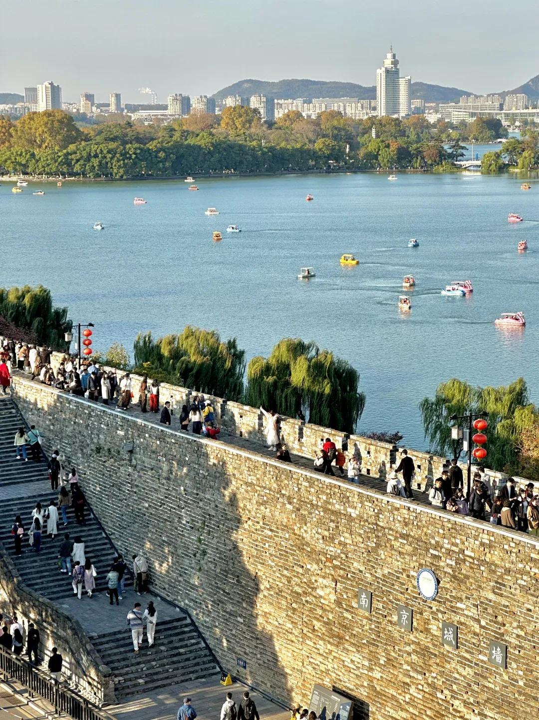 站在城上,玄武湖全景展开。远处紫金山绵延。下去坐船吧。玄武湖太大,走着累。三十元观光车省力。或者就泛舟湖上,让风带方向。