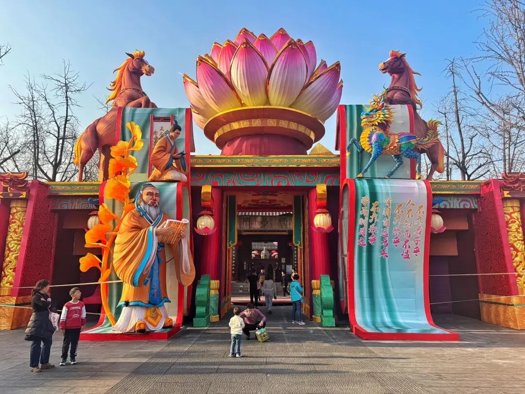 大成殿展区的灯会特色,是将儒学文化的深厚底蕴与神话传说的奇幻色彩相结合。