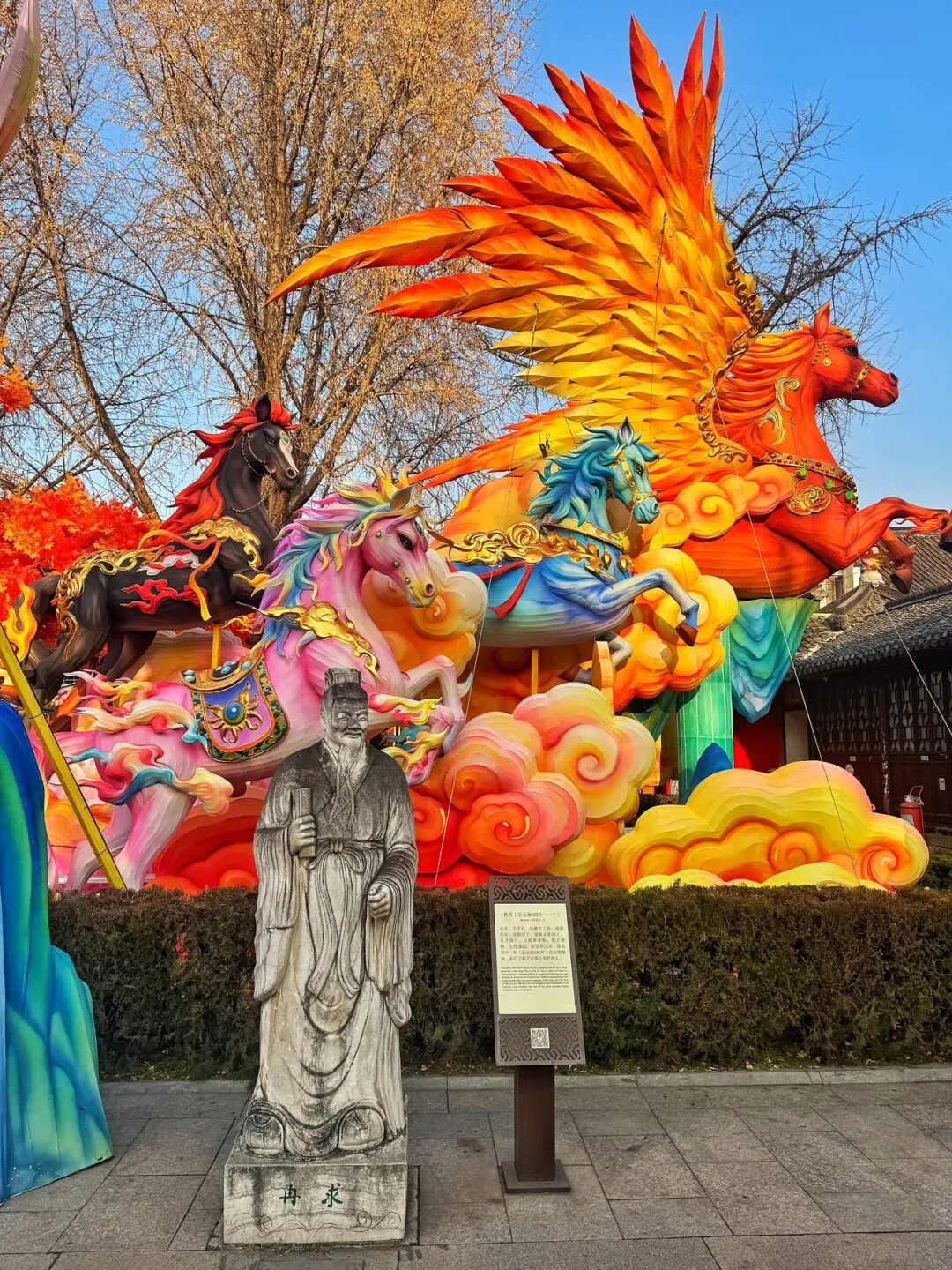 殿前步道两侧,排列着冉求等孔子众弟子雕塑,在光影中沉思,古人穿越到了今天的花花世界,肯定有点懵懂。