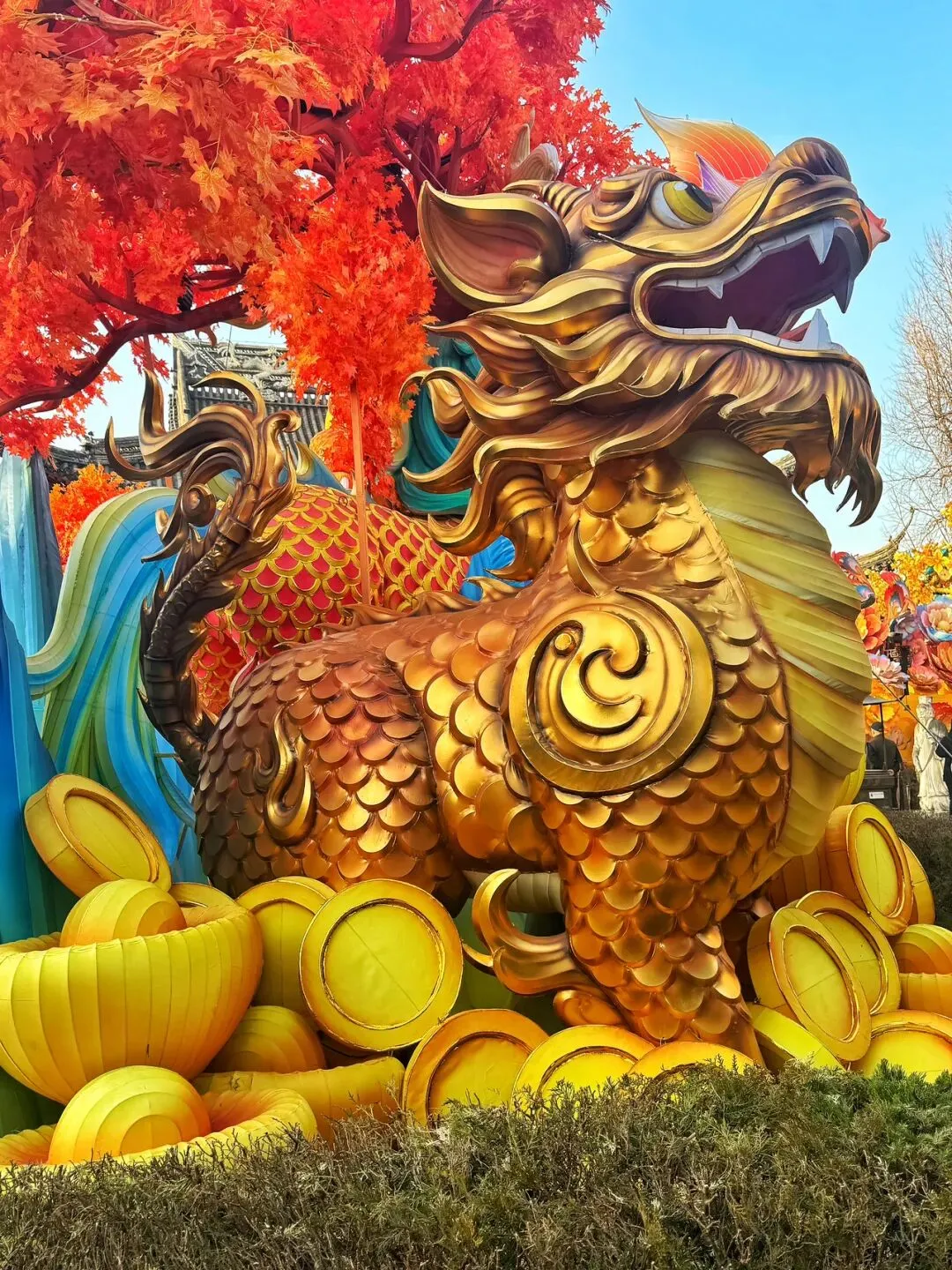 大成殿前,祥瑞动物齐聚一堂,飞马展翅、貔貅纳福、麒麟献瑞、金蟾招财、神鹿引蝶等,流光溢彩,仿佛是一幅流动的祥瑞画卷。