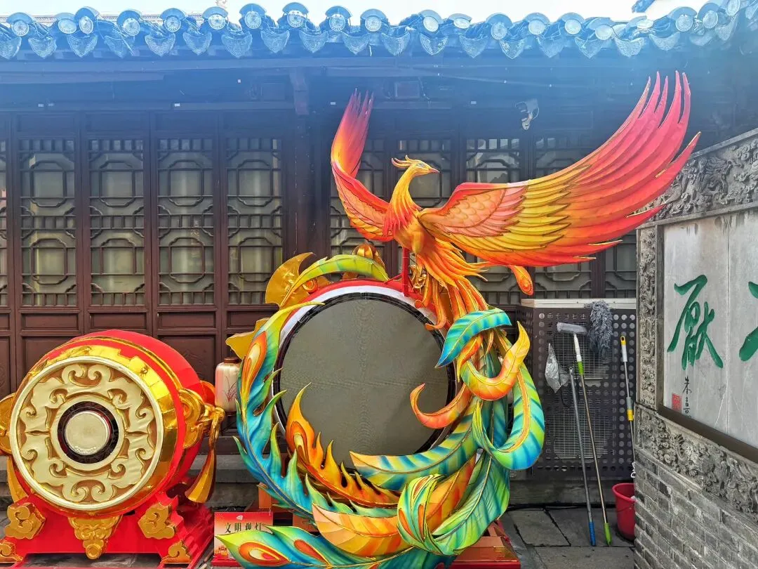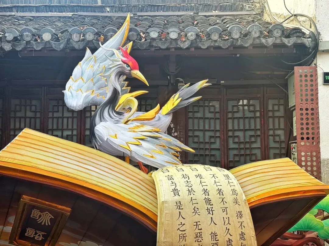 明德堂前,“凤凰来仪”主灯高约12米,仰望有花,回眸见凤。一束繁花自穹顶垂落,如云霞倒悬;凤影自九天而降,昂首垂翼,俯瞰人间。赤红羽衣缀满流光灯线,翎羽层层叠叠泛着鎏金光芒,羽翼舒展栩栩如生,仿佛就要冲破殿宇,振翅翱翔。据说创作灵感源自夫子“凤鸟不至”之叹。