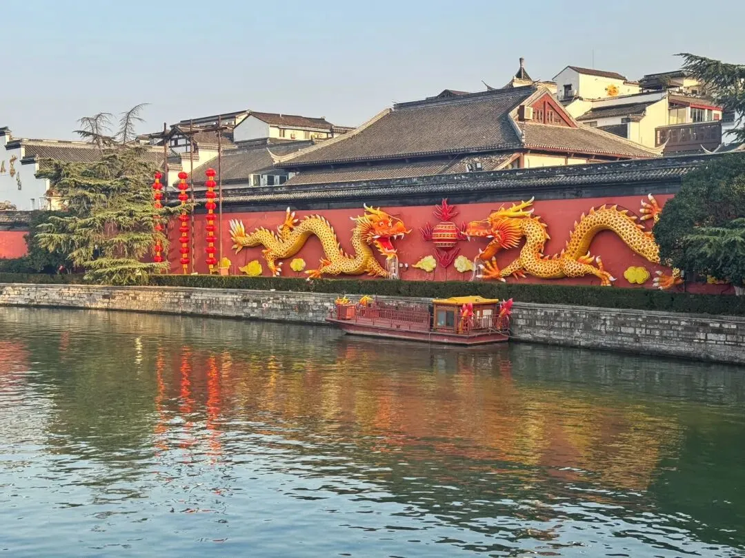 夫子庙大照壁,位于秦淮河南岸,建于明万历三年(1575年),全长110米,为中国照壁之最。照壁前泊着画舫,夜晚会有歌舞表演。